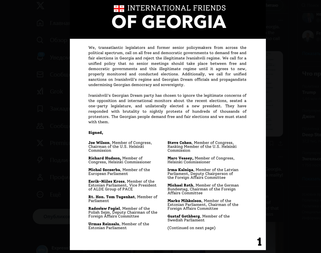 43 ამერიკელი და ევროპელი პოლიტიკოსი მთავრობებს მოუწოდებს, მოითხოვონ საქართველოში სამართლიანი არჩევნები