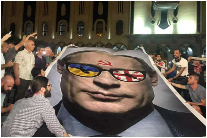 პარლამენტის წინ ბანერზე გამოსახულ პუტინის ფოტოს გადაუარეს