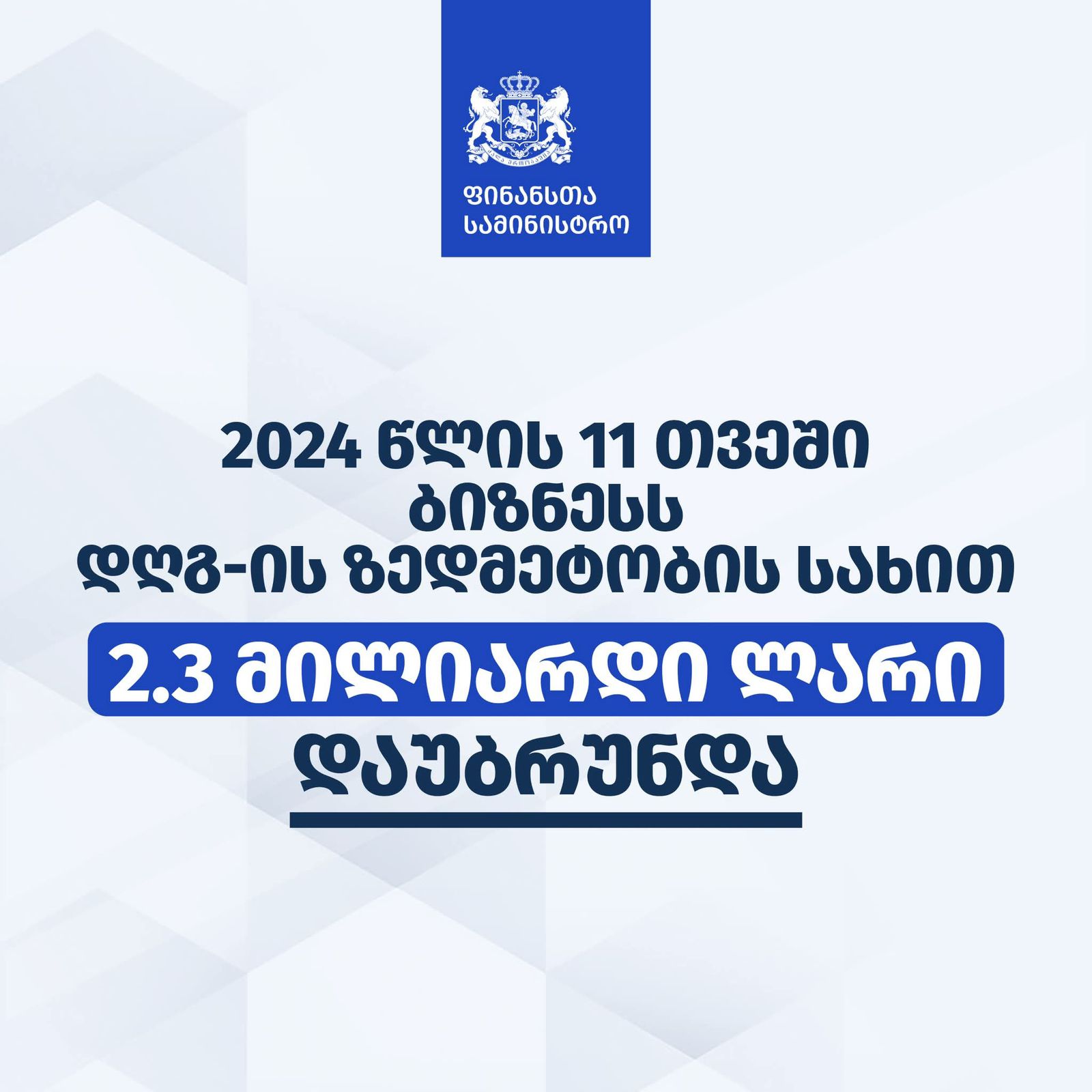 ფინანსთა სამინისტრო - 11 თვეში ბიზნესს დღგ-ის ზედმეტობის სახით, ავტომატურად, 2.3 მლრდ ლარი დაუბრუნდა