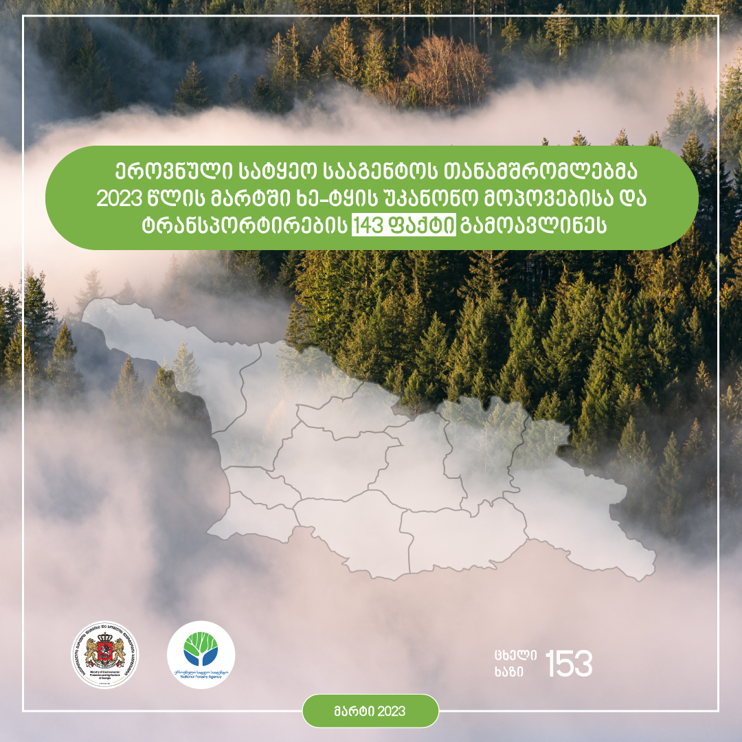 ეროვნული სატყეო სააგენტოს თანამშრომლებმა, 2023 წლის მარტში, ხე-ტყის უკანონო მოპოვებისა და ტრანსპორტირების 143 ფაქტი გამოავლინეს