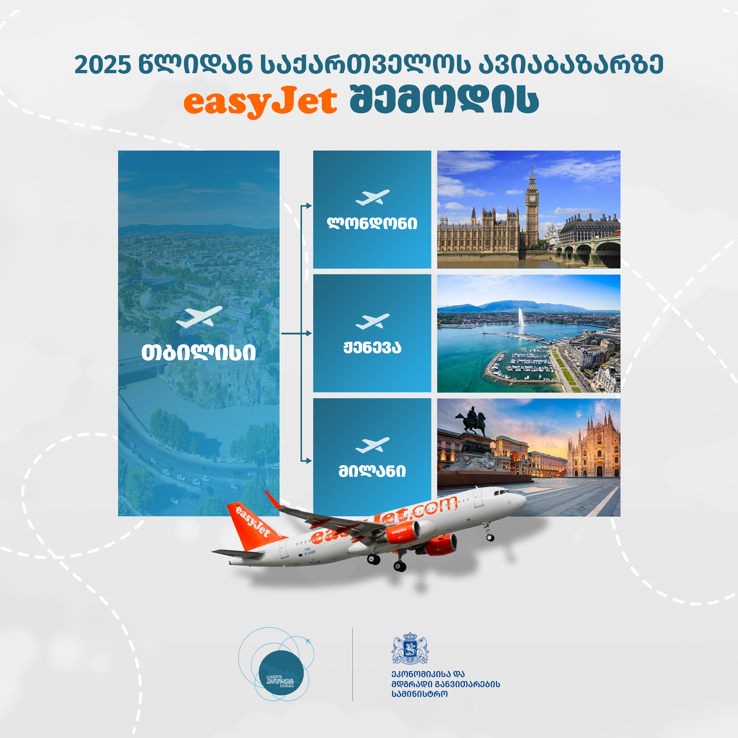 ბრიტანული დაბალბიუჯეტური ავიაკომპანია easyJet 2025 წლიდან თბილისში ლონდონიდან, ჟენევიდან და მილანიდან პირდაპირ ფრენებს შეასრულებს