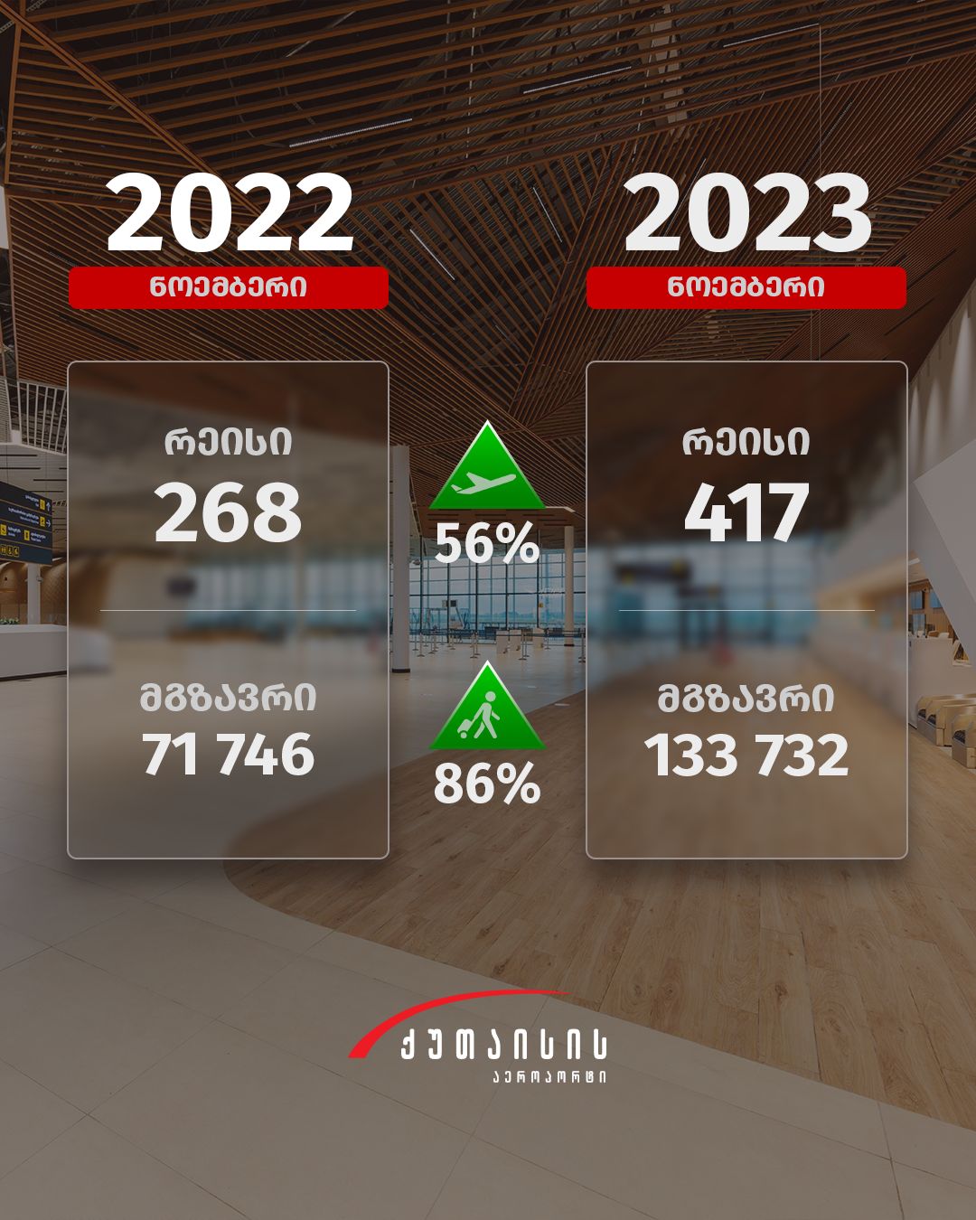 აეროპორტების გაერთიანება - ნოემბერში ქუთაისის საერთაშორისო აეროპორტის მგზავრთნაკადი 86%-ით გაიზარდა