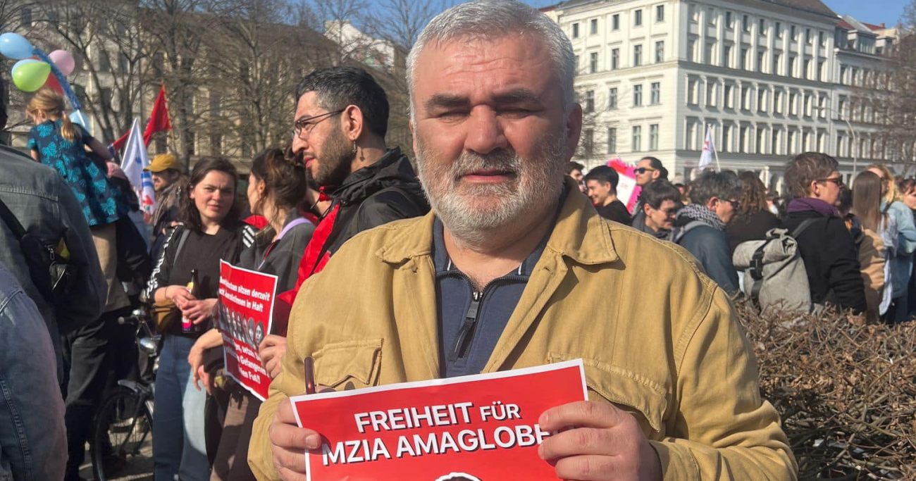 ბერლინში ქალი ჟურნალისტების მხარდამჭერ აქციაზე აფგან მუხთარლი ამაღლობელის პლაკატით მივიდა