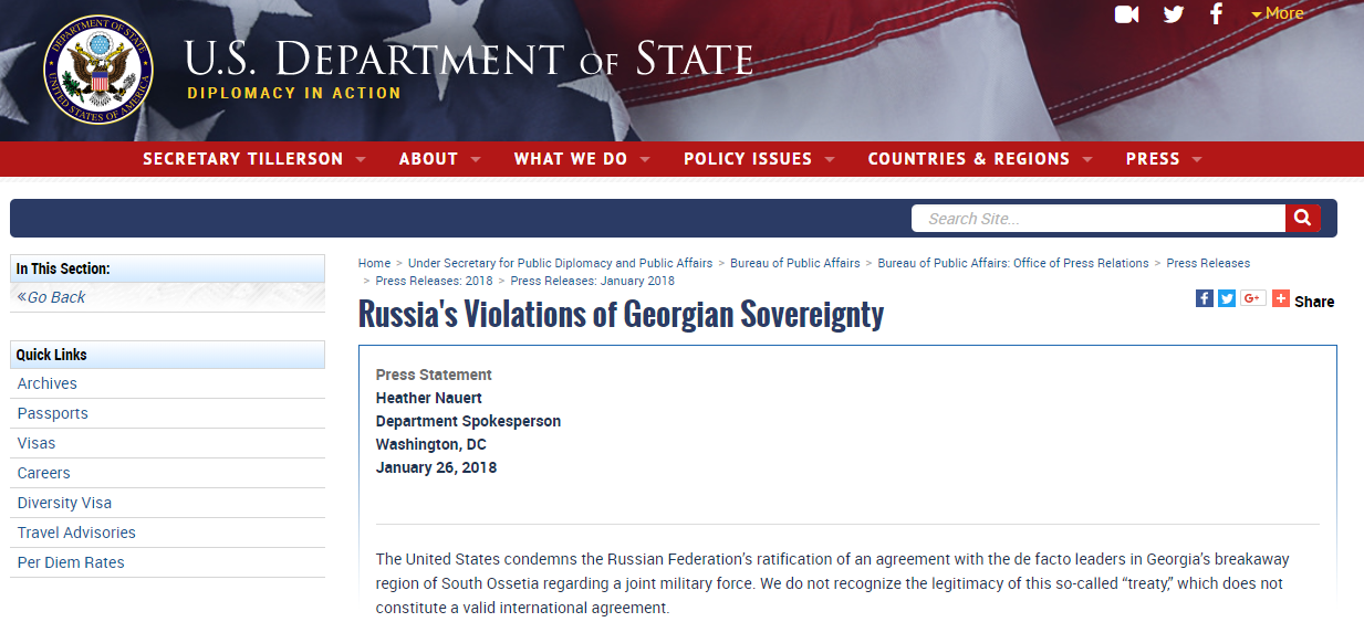 აშშ რუსეთის მხრიდან ე.წ. სამხრეთ ოსეთის დე-ფაქტო ლიდერებთან გაფორმებულ შეთანხმებას გმობს