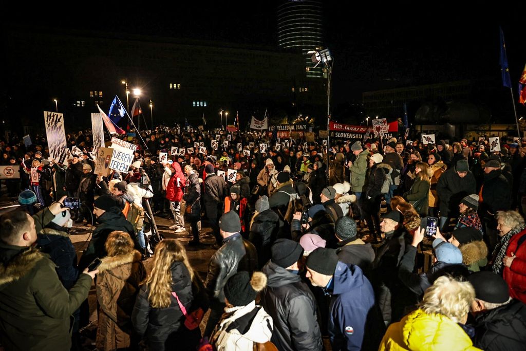 ფიცოს წინააღმდეგ და უკრაინის მხარდასაჭერად ბრატისლავაში ათასობით ადამიანი გამოვიდა