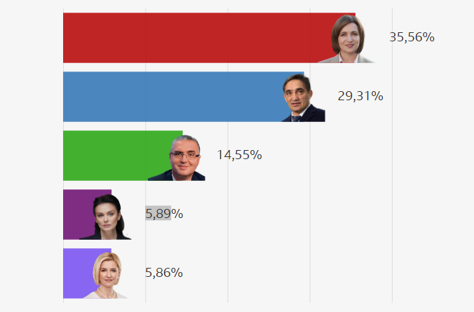 ბიულეტენების 97%-ზე მეტის დათვლის შემდეგ, მოლდოვის საპრეზიდენტო არჩევნებში მაია სანდუ 41.55%-ით ლიდერობს