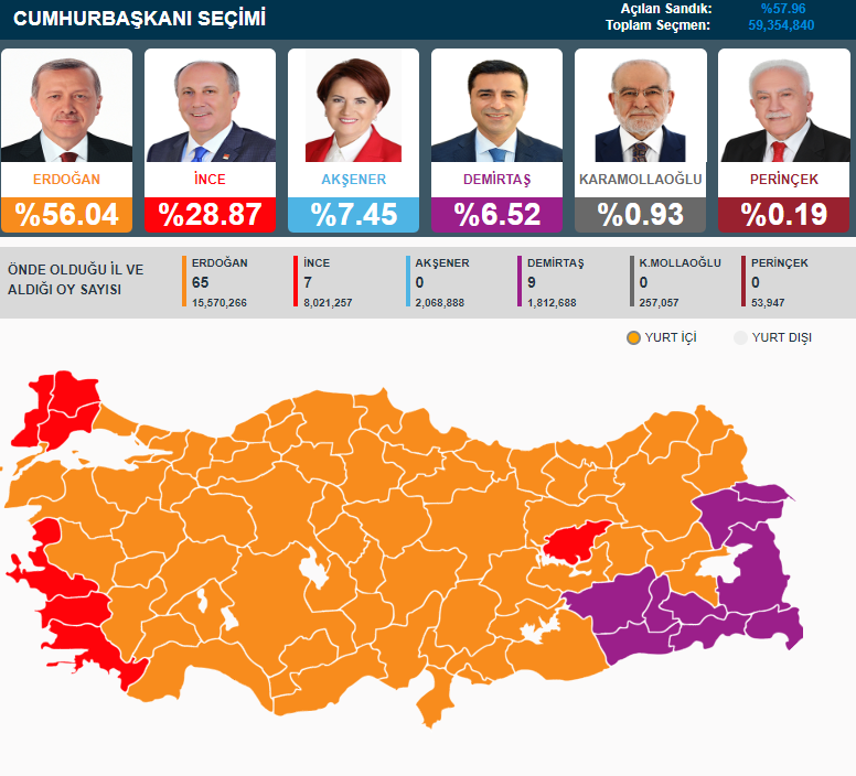 დათვლილი ბიულეტინების 59,79 % მონაცემებით ერდოღანს ხმათა 55%, აქვს ხოლო ინჯეს 28.95%