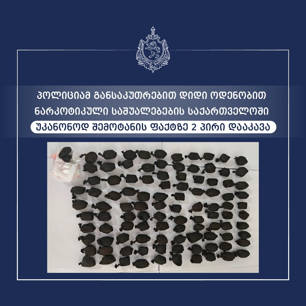 პოლიციამ განსაკუთრებით დიდი ოდენობით ნარკოტიკული საშუალებების საქართველოში უკანონოდ შემოტანის ფაქტზე 2 პირი დააკავა