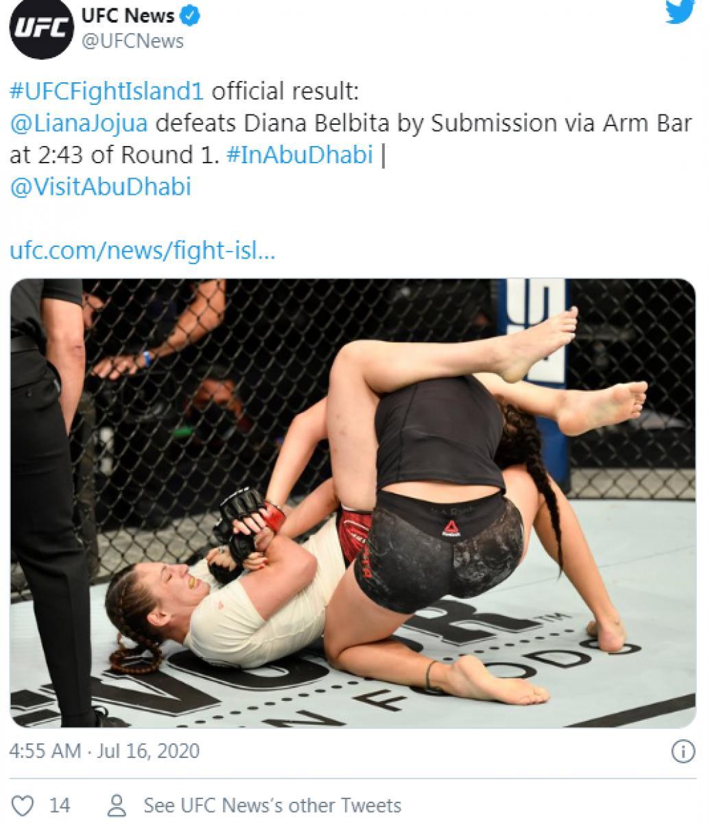 ლიანა ჯოჯუამ გამთენიისას UFC-ში პირველი გამარჯვება იზეიმა. მისი მეტოქე რუმინელი დიანა ბელბიტა იყო, რომლის ანგარიშზეც 18 ბრძოლიდან მხოლოდ 5 მარცხი იყო. ქართველმა ქალმა სპორტსმენმა მეტოქე სახიფათო ილეთზე დაიჭირა, რის შემდეგაც რუმინელი მას დანებდა და ბრძოლაც პირველივე რაუნდში მორჩა. ბრძოლა აბუ დაბიში, „მებრძოლთა კუნძულზე“ გაიმართა.