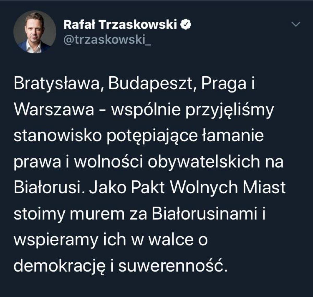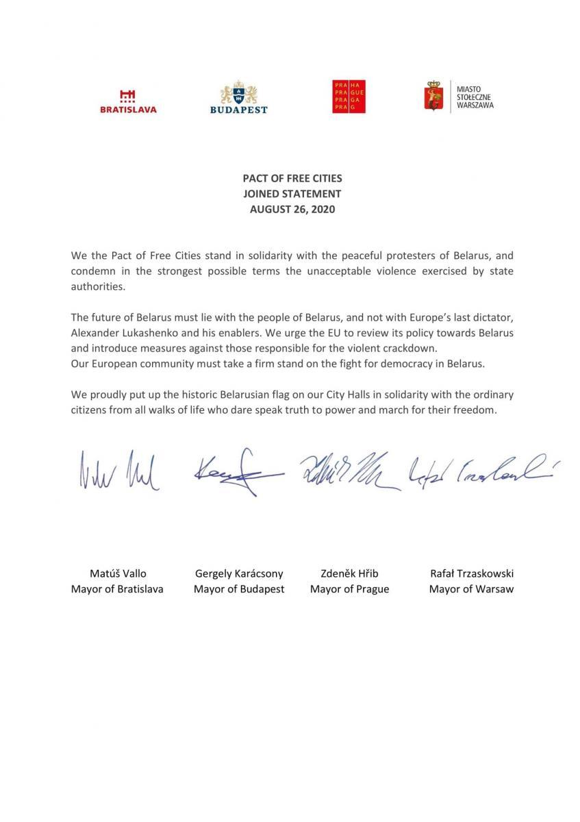 ვარშავაში, პრაღაში, ბუდაპეშტში და ბრატისლავაში ბელარუსის ისტორიული დროშა აღიმართება. ამის შესახებ ვაშავის მერი, რაფალ ტრჟასკოვსკი Twitter-ზე ავრცელებს ინფორმაციას. „ჩვენ, თავისუფალი ქალაქების პაქტი, სოლიდარობას ვუცხადებთ ბელარუსის მშვიდობიან მომიტინგეებს და მტკიცედ ვგმობთ მაღალჩინოსნების მიერ მიუღებელ ძალადობას. ბელარუსის მომავალი უნდა იყოს ბელორუს ხალხთან, და არა ევროპის ბოლო დიქტატორ ალექსანდერ ლუკაშენკოსა და მათთან, ვინც მას ხელს უწყობს. ჩვენ დაჟინებით მოვუწოდებთ ევროკავშირს, გადახედოს ბელორუსის მიმართ მის პოლიტიკას და მიიღოს ზომები მათ წინააღმდეგ, ვინც ძალადობრივ დარბევაზეა პასუხისმგებელი. ჩვენმა ევროპულმა საზოგადოებამ მტკიცე პოზიცია უნდა დაიჭიროს დემოკრატიული ბელარუსისთვის ბრძოლაში. ჩვენ სიამაყით აღვმართავთ ისტორიული ბელორუსის დროშას ჩვენს მერიებში ყველა სფეროს ჩვეულებრივი მოქალაქეების სოლიდარობის ნიშნად, რომლებიც ძალაუფლებასთან ბედავენ სიმართლის ლაპარაკს და თავისუფლებისთვის მსვლელობას მართავენ“, – ვკითხულობთ სოციალურ ქსელში გავრცელებულ დოკუმენტში.