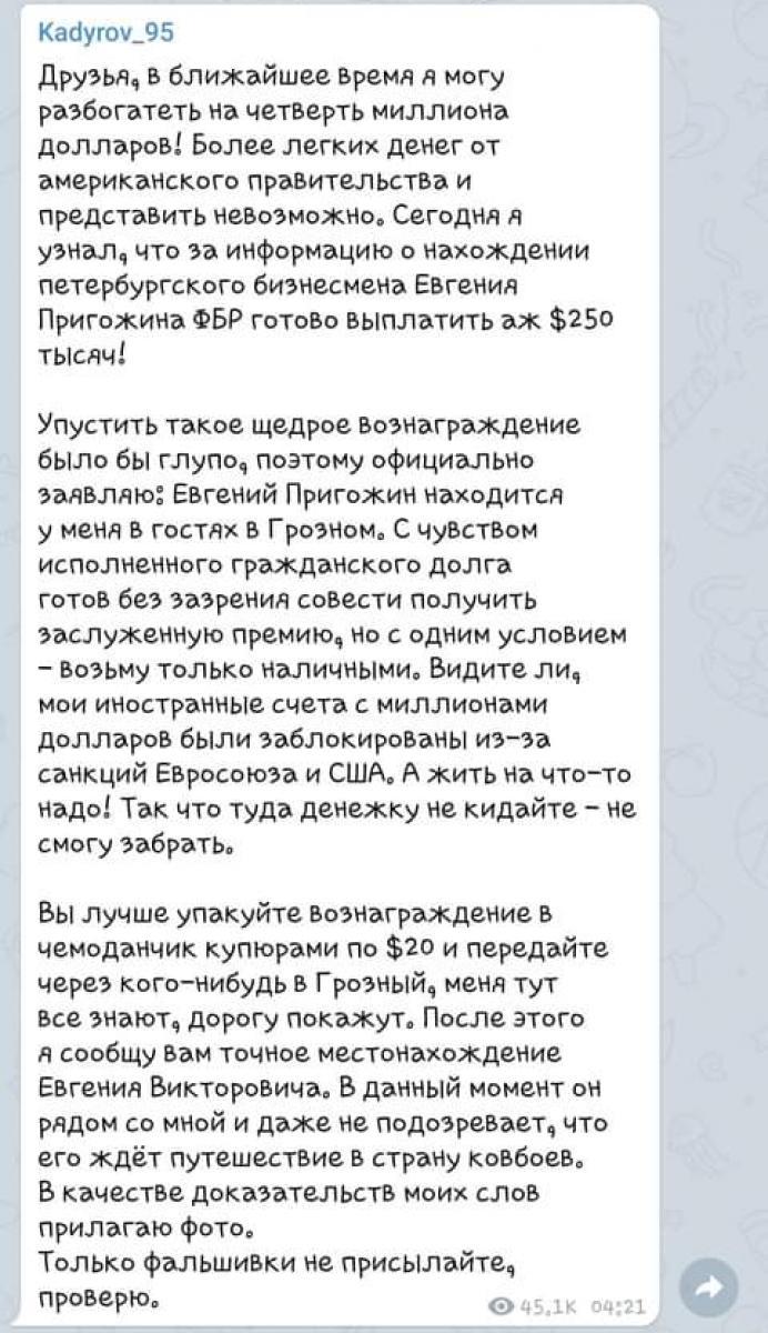დღეს გავიგე, რომ პეტერბურგელ ბიზნესმენ ევგენი პრიგოჟინზე ინფორმაციის სანაცვლოდ FBI მზადაა, $250 ათასი გადაიხადოს“, - წერს კადიროვი.