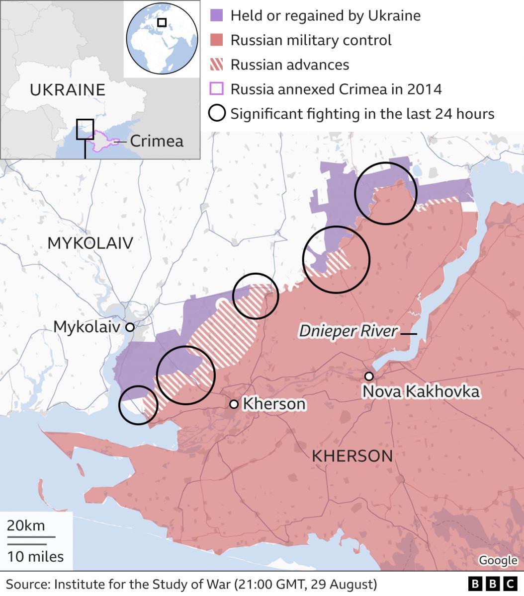 უკრაინა ცდილობს დაიბრუნოს რუსეთის მიერ ოკუპირებული სამხრეთ ხერსონის რეგიონი, მაგრამ ეს "სასტიკი ბრძოლების" ფასად უჯდება. სამხედრო ექსპერტებმა BBC-ს განუცხადეს, რომ ეს პროცესი "სწრაფად არ მოხდება". ”მძიმე ბრძოლები გრძელდება, ჩვენი ჯარისკაცები მთელი საათის განმავლობაში მუშაობენ”, - თქვა ვიტალი კიმმა, რომელიც მეზობელ მიკოლაივის რეგიონს ხელმძღვანელობს. უკრაინამ განაცხადა, რომ მან გაარღვია რუსეთის თავდაცვის პირველი ხაზი. მაგრამ რუსეთმა განაცხადა, რომ უკრაინის ჯარები დამარცხდნენ წარუმატებელი თავდასხმის დროს. მოსკოვის თავდაცვის სამინისტრომ ასევე განაცხადა, რომ უკრაინულ ძალებს შორის დიდი მსხვერპლი იყო. ხერსონი გახდა პირველი უკრაინული ქალაქი, რომელიც რუსეთის ხელში ჩავარდა მოსკოვის შემოჭრის პირველ დღეებში, რომელიც 24 თებერვალს დაიწყო. სამშაბათს უკრაინის ოპერატიული სარდლობა "სამხრეთმა" განაცხადა, რომ ხერსონში "პოზიციური ბრძოლები" გრძელდება. ბოლო კვირების განმავლობაში უკრაინა ასევე იყენებდა აშშ-ს მიერ მიწოდებულ Himars-ის ზუსტი სარაკეტო სისტემებს იმპროვიზირებული რუსული პონტონური ხიდების, ასევე სამეთაურო პუნქტებისა და საბრძოლო მასალის საწყობების დასამიზნებლად. შეტევა დიდწილად მდინარის მარჯვენა (დასავლეთ) ნაპირზე მიმდინარეობს, რაც პრაქტიკულად შეუძლებელს ხდის რუსული ჯარების გაგზავნას და იარაღის მარაგის მოპოვებას. თუმცა, კიევის ოფიციალური პირები შეტევას აღწერენ, როგორც მტრის ნელ დაშლას. ამას, როგორც ჩანს, ეთანხმება BBC-ის მიერ გამოკითხული რამდენიმე სამხედრო ექსპერტი. „გრძელვადიანი მიზანი არის რუსული სამხედრო შესაძლებლობების თანდათანობით შესუსტება და უკრაინის შესაძლებლობების თანდათანობითი გაძლიერება დასავლეთის დახმარებით“, - თქვა სერ ალექს იანგერმა, ბრიტანეთის MI6 საიდუმლო სადაზვერვო სამსახურის ყოფილმა ხელმძღვანელმა. მან თქვა, რომ ხერსონის კონტრშეტევა იყო "ყველაფერი უკრაინის მოწოდებაზე, აჩვენოს, რომ მათ შეუძლიათ ფეხზე დგომა". ჯასტინ ბრონკმა, სამეფო გაერთიანებული სერვისების ინსტიტუტის (Rusi) თავდაცვის ანალიტიკური ცენტრის უფროსმა მკვლევარმა, განუცხადა BBC-ს, რომ მას სჯერა, რომ უკრაინა გააგრძელებს დარტყმებს ჰიმარის გამოყენებით, რადგან ისინი წარმატებული აღმოჩნდნენ რუსული მიწოდების ხაზების გაწყვეტაში. იმავდროულად, უკრაინელმა სამხედრო ექსპერტმა მიხაილო ჟიროხოვმა BBC-ს განუცხადა: ”ჩვენ არ უნდა ველოდოთ კავალერიის თავდასხმას, რადგან უკრაინის შეიარაღებული ძალების გენერალურ შტაბს არ სურს ქუჩის ჩხუბი [ხერსონში] - რაც გამოიწვევს დიდ 