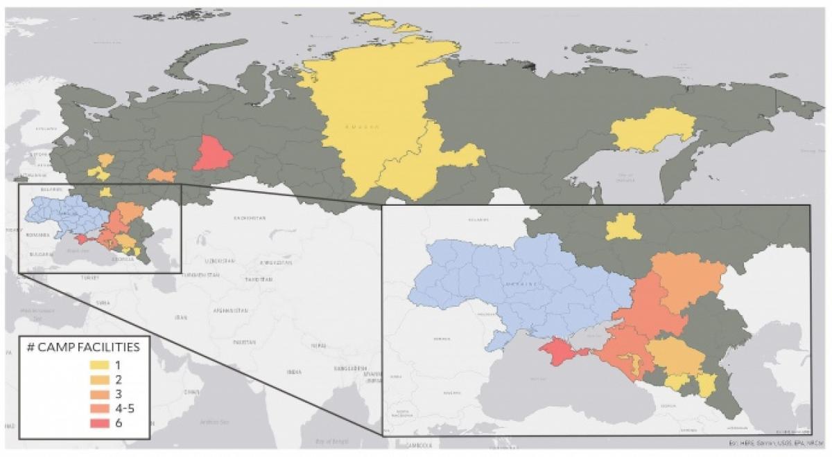 რუსეთსა და ოკუპირებული ყირიმის ტერიტორიაზე უკრაინელი ბავშვების „საგანმანათლებლო ბანაკები“ მოქმედებს. ამის შესახებ იელის უნივერსიტეტის ჰუმანიტარულ მეცნიერებათა კვლევის ლაბორატორიის ანგარიშშია ნათქვამი. გამოძიების ავტორების ინფორმაციით, რუსეთისა და ანექსირებული ყირიმის ტერიტორიაზე მინიმუმ 43 დაწესებულების ქსელია, რომელთა უმეტესობა უკრაინიდან 4 თვიდან 17 წლამდე ასაკის ბავშვების „იდეოლოგიურ გადამზადებას“ ახორციელებენ. მკვლევარების შეფასებით, 2022 წლის 24 თებერვლიდან ამ ბანაკებში 6000-ზე მეტი უკრაინელი ბავშვი შევიდა. ამავე დროს, ისინი აღიარებენ, რომ ბავშვების რეალური რაოდენობა შესაძლოა გაცილებით მეტი იყოს. ბანაკების უმეტესობა სამედიცინო დაწესებულებებშია განთავსებული. ზოგიერთი კი, უკრაინელი ბავშვების რუსეთის ფედერაციაში აღსაზრდელად ან გასაშვილებლად არის გამოყენებული. ამ ინსტიტუტების უმეტესობა დროებით ოკუპირებულ ყირიმში მდებარეობს. თუმცა, 10 ბანაკი მდებარეობს რუსეთის დიდი ქალაქებიდან არც თუ ისე შორს - მოსკოვი, ყაზანი და ეკატერინბურგი. ასევე არის ბანაკები ციმბირსა და შორეულ აღმოსავლეთში.