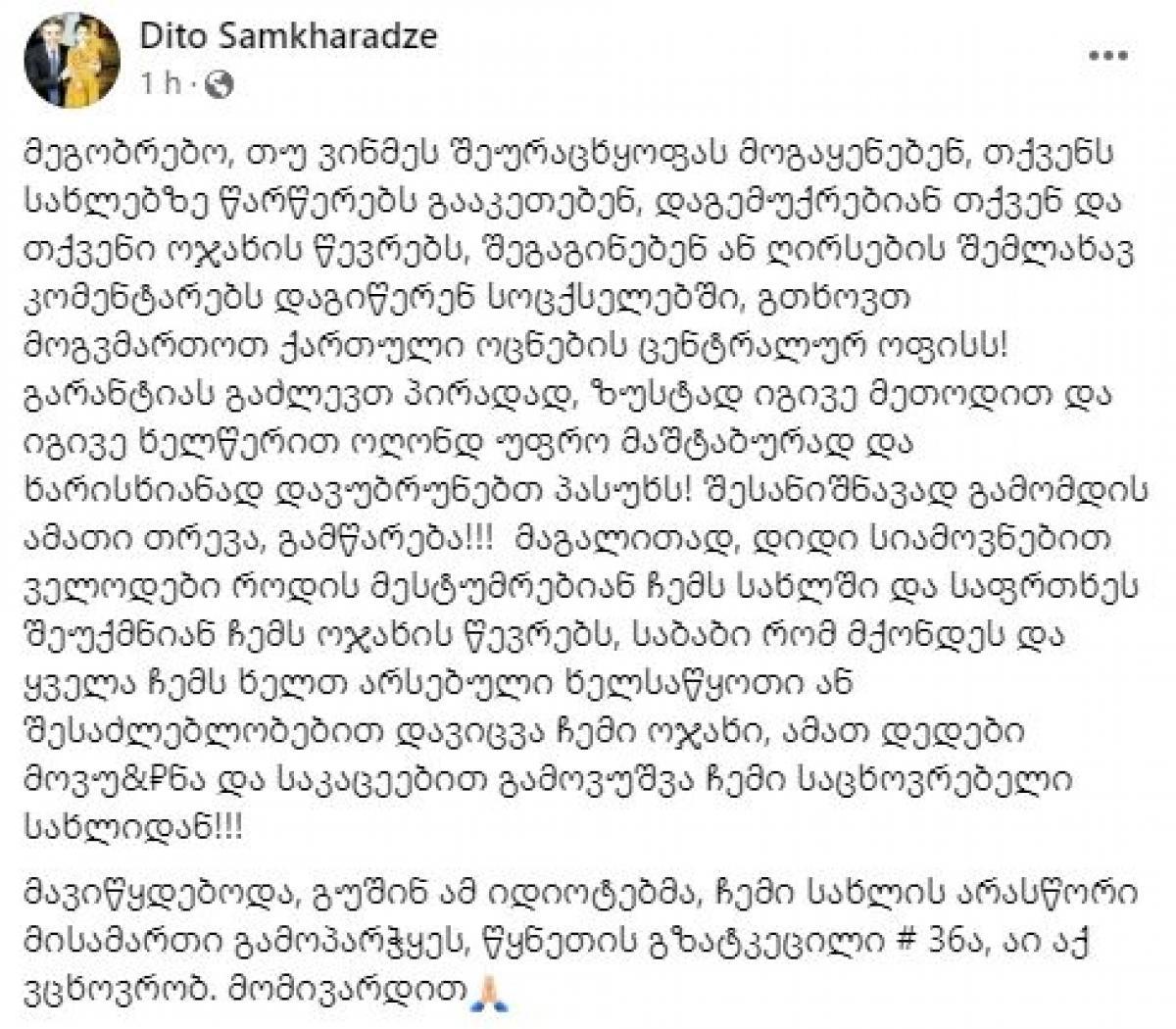 "ქართული ოცნების" რეგიონული მდივანი დიტო სამხარაძე სოციალურ ქსელში მუქარის შემცველ წერილს აქვეყნებს და ამბობს, რომ მმართველი პარტიის ცენტრალურ ოფისში მზად არიან "მასშტაბურად და ხარისხიანად" დაუბრუნონ პასუხი ყველას, ვინც მათ ამომრჩეველს დისკომფორტს შეუქმნის. სამხარაძე ასევე ხელთ არსებული ხელსაწყოთი ელოდება ვინმეს, ვინც " საფრთხეს შეუქმნის ოჯახის წევრებს", რათა "საკაცეებით გაუშვას საცხოვრებელი სახლიდან". "მეგობრებო, თუ ვინმეს შეურაცხყოფას მოგაყენებენ, თქვენს სახლებზე წარწერებს გააკეთებენ, დაგემუქრებიან თქვენ და თქვენი ოჯახის წევრებს, შეგაგინებენ ან ღირსების შემლახავ კომენტარებს დაგიწერენ სოცქსელებში, გთხოვთ მოგვმართოთ "ქართული ოცნების" ცენტრალურ ოფისს! გარანტიას გაძლევთ პირადად, ზუსტად იგივე მეთოდით და იგივე ხელწერით ოღონდ უფრო მაშტაბურად და ხარისხიანად დავუბრუნებთ პასუხს! შესანიშნავად გამომდის ამათი თრევა, გამწარება!!! მაგალითად, დიდი სიამოვნებით ველოდები როდის მესტუმრებიან ჩემს სახლში და საფრთხეს შეუქმნიან ჩემს ოჯახის წევრებს, საბაბი რომ მქონდეს და ყველა ჩემს ხელთ არსებული ხელსაწყოთი ან შესაძლებლობებით დავიცვა ჩემი ოჯახი, ამათ დედები მოვუ&₽ნა და საკაცეებით გამოვუშვა ჩემი საცხოვრებელი სახლიდან!!! მავიწყდებოდა, გუშინ ამ იდიოტებმა, ჩემი სახლის არასწორი მისამართი გამოპარჭყეს, წყნეთის გზატკეცილი # 36ა, აი აქ ვცხოვრობ. მომივარდით",- წერს დიტო სამხარაძე.