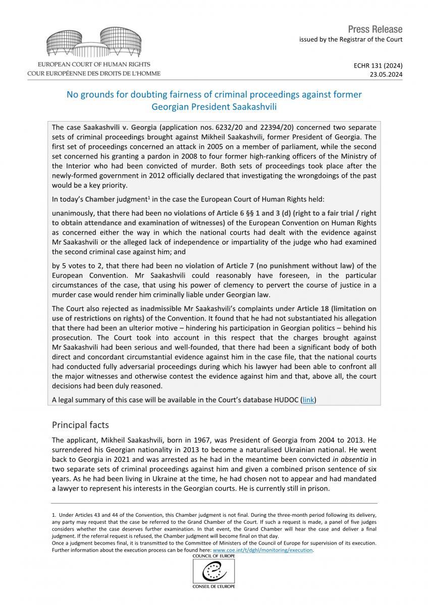 ადამიანის უფლებათა ევროპული სასამართლო საქმეზე "სააკაშვილი საქართველოს წინააღმდეგ" გამოტანილ გადაწყვეტილებასთან დაკავშირებით ინფორმაციას ავრცელებს. როგორც სტრასბურგის სასამართლოს პრესრელიზშია ნათქვამი, საქართველოს მესამე პრეზიდენტის, მიხეილ სააკაშვილის წინააღმდეგ სისხლის სამართლებრივი პროცესის სამართლიანობაში ეჭვის შეტანის საფუძველი არ არსებობს. პრესსრელიზში აღნიშნულია, რომ გადაწყვეტილება ეხება სააკაშვილის წინააღმდეგ აღძრულ ორ სისხლის სამართლის საქმეს. პირველი საქმე ეხება 2005 წელს პარლამენტის წევრზე განხორციელებულ თავდასხმას, ხოლო მეორე საქმე სააკაშვილის მიერ მკვლელობაში ბრალდებული, შინაგან საქმეთა სამინისტროს ოთხი ყოფილი მაღალჩინოსანი ოფიცრის შეწყალებას. „დღევანდელი გადაწყვეტილებით, ევროპის ადამიანის უფლებათა დაცვის სასამართლომ ერთსულოვნად დაადგინა, რომ სააკაშვილის საქმეების განხილვისას არ ყოფილა დარღვეული ადამიანის უფლებათა ევროპული კონვენციის მე-6 მუხლის 1-ელი და მე-3 პუნქტები, რომლებიც ეხება სამართლიანი სასამართლოს უფლებას და დაკითხვაზე ადვოკატთან ერთად დასწრების უფლებას",- ნათქვამია რელიზში. ამასთან, სტრასბურგის სასამართლოს ინფორმაციით, ადგილი არ ჰქონია არც კონვენციის მე-7 მუხლის დარღვევას, რომელიც კანონის გარეშე დასჯის დაუშვებლობას ეხება. "სააკაშვილს შეეძლო, გონივრულად განეჭვრიტა, საქმის კონკრეტულ გარემოებების გათვალისწინებით, რომ მკვლელობის საქმეზე შეწყალების უფლების გამოყენება, მართლმსაჯულების კურსის დამახინჯების მიზნით, მას ქართული კანონმდებლობის მიხედვით, სისხლის სამართლის პასუხისმგებლობას დააკისრებდა“,- აღნიშნულია პრესრელიზში. სასამართლომ ასევე განსახილველად დაუშვებლად ცნო სააკაშვილის საჩივრები კონვენციის მე-18 მუხლის დარღვევის შესახებ, რომელიც ეხება უფლებათა შეზღუდვის გამოყენების შეზღუდვას. სასამართლომ დაადგინა, რომ "მას არ დაუსაბუთებია თავისი ბრალდება, რომ მისი დევნის უკან არსებობდა ფარული მოტივი, კერძოდ ის ამტკიცებდა, რომ ეს ხელს უშლიდა მის მონაწილეობას ქართულ პოლიტიკაში". სასამართლომ ამ კუთხით გაითვალისწინა - "სააკაშვილის წინააღმდეგ წარდგენილი ბრალდებები იყო სერიოზული და დასაბუთებული, საქმის მასალებში არსებობდა მის წინააღმდეგ, როგორც პირდაპირი, ისე თანმიმდევრული მტკიცებულებები, რომ ეროვნულმა სასამართლოებმა ჩაატარეს სრულიად შეჯიბრებითი პროცესი, რომლის დროსაც მისმა ადვოკატმა შეძლო ყველა მთავარ მოწმესთან დაპირისპირება, მის წინააღმდეგ მტკიცებულებების გ