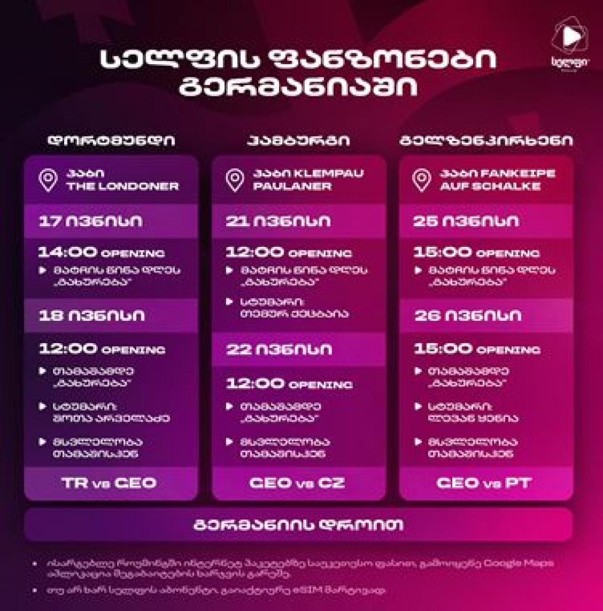"სელფი", ქართული მობილური ოპერატორი, რომელიც საქართველოს მასშტაბით 1.3 მლნ. აბონენტს ემსახურება, საქართველოს ფეხბურთის ეროვნული ნაკრების, ევროპის ჩემპიონატზე ისტორიულ გასვლასთან დაკავშირებით, ქომაგებს შესაძლებლობას აძლევს გერმანიაში, სამივე ქალაქში სადაც საქართველოს ნაკრების მატჩები იმართება, ეწვიონ სპეციალურად მოწყობილ საგულშემატკივრო სივრცეებს ე.წ. ფანზონებს. სამივე ქალაქში ფანზონები პოპულარულ ბარებშია განთავსებული, რაც შესაძლებლობას მიცემს ქომაგებს მატჩამდე ერთად გახურდნენ. შესაბამის გაფორმებასთან ერთად, პირველ შემოსულ სტუმრებს დახვდებათ "სელფის" საჩუქრები. სამივე ლოკაციაზე, მატჩის დღეს, თამაშის დაწყებამდე, ფანზონას ესტუმრება ქართული ფეხბურთის ლეგენდა: შოთა არველაძე - დორტმუნდში, თემურ ქეცბაია - ჰამბურგში და ლევან ყენია - გელზენკირხენში. ფანზონების განთავსების მისამართებია: დორტმუნდი: The Londoner |18 ივნისი