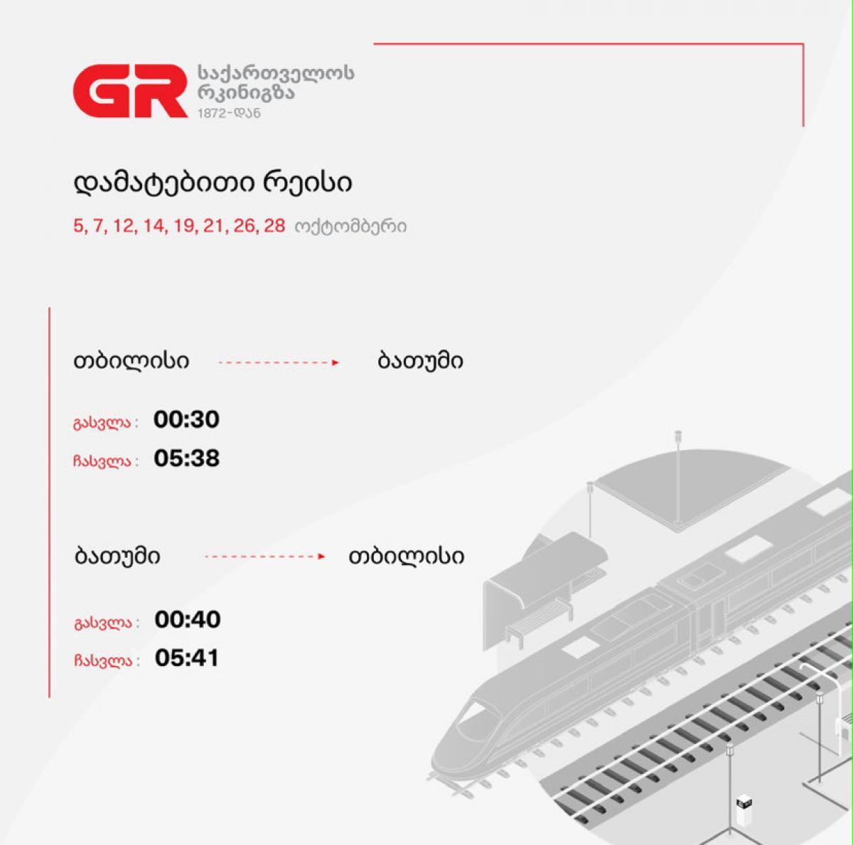 "საქართველოს რკინიგზა", გაზრდილი მგზავრთნაკადის გამო, თბილისი-ბათუმი-თბილისის მიმართულებით რეისებს ამატებს. მათი ცნობით, რეისების დამატება 5,7,12, 14, 19, 21, 26, 28 ოქტომბერს მოხდება. "ძვირფასო მგზავრებო! გაზრდილი მგზავრთნაკადის გამო, "საქართველოს რკინიგზა" 5,7,12, 14, 19, 21, 26, 28 ოქტომბერს თბილისი-ბათუმი-თბილისის მიმართულებით რეისებს ამატებს. მატარებლების მოძრაობის განრიგი იხილეთ თანდართულ ცხრილში: ბილეთების შეძენა შესაძლებელია: ჩვენი ვებ-გვერდის საშუალებით: https://ticket.railway.ge სწრაფი გადახდის აპარატებით; "საქართველოს რკინიგზის" სალაროებში; "საქართველოს რკინიგზის" პარტნიორი კომპანიების მეშვეობით",- ნათქვამია ინფორმაციაში.