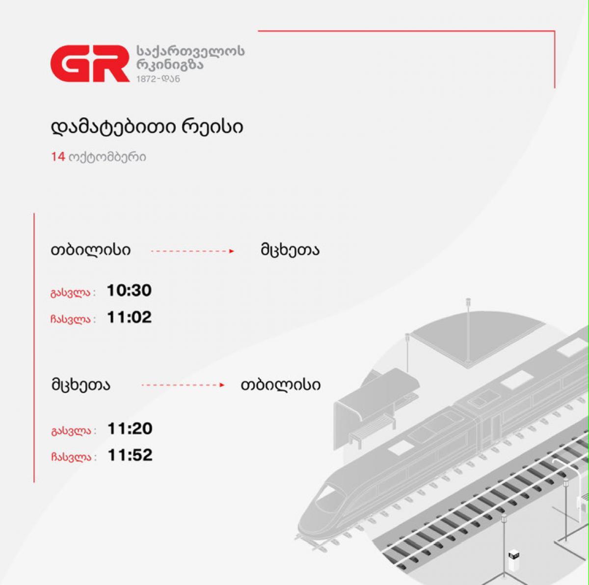 "14 ოქტომბერს, სვეტიცხოვლობის დღესასწაულთან დაკავშირებით, "საქარველოს რკინიგზა" ქალაქ მცხეთის მიმართულებით უფასო რეისებს ნიშნავს.