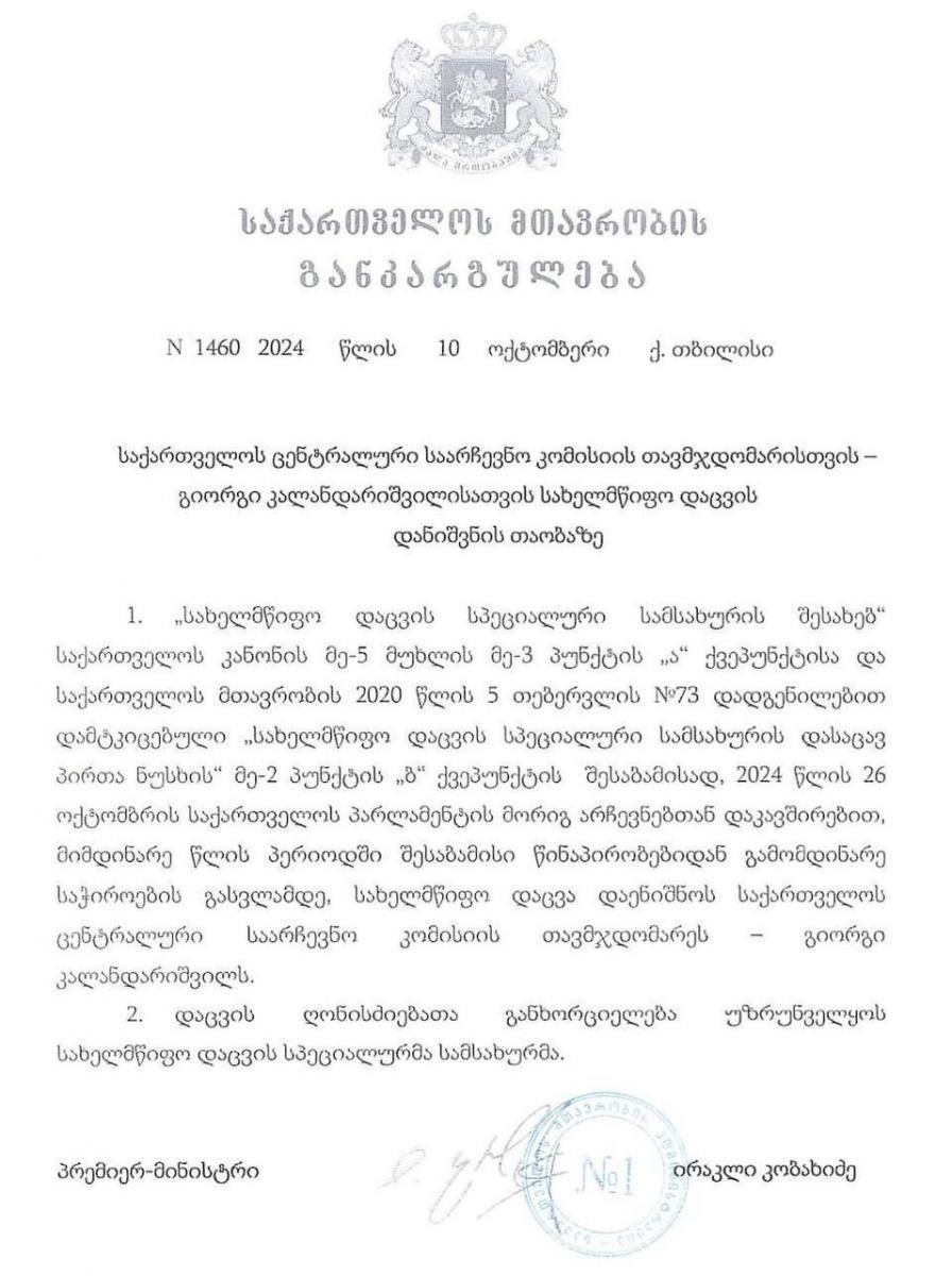 "მიმდინარე წლის პერიოდში შესაბამისი წინაპირობებიდან გამომდინარე საჭიროების გასვლამდე, სახელმწიფო დაცვა დაენიშნოს საქართველოს ცენტრალური საარჩევნო კომისიის თავმჯდომარეს - გიორგი კალანდარიშვილს. დაცვის ღონისძიებათა განხორციელება უზრუნველყოს სახელმწიფო დაცვის სპეციალურმა სამსახურმა", - ნათქვამია განკარგულებაში.