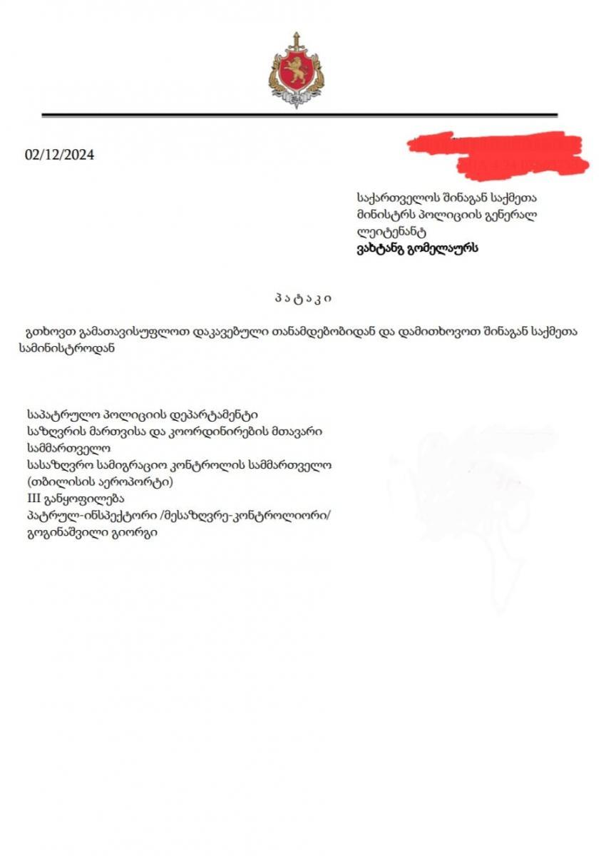 შსს-ს თანამშრომელი გიორგი გოგინაშვილი თანამდებობას ტოვებს