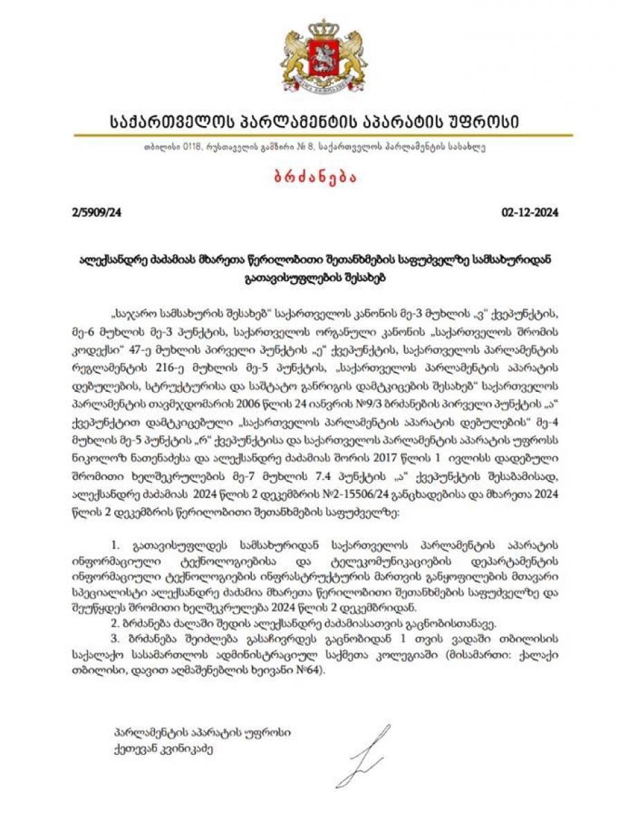 ალექსანდრე ძაძამიას სამსახურიდან გათავისუფლების შესახებ ბრძანებას ხელს პარლამენტის აპარატის უფროსი ქეთევან კვინიკაძე აწერს.