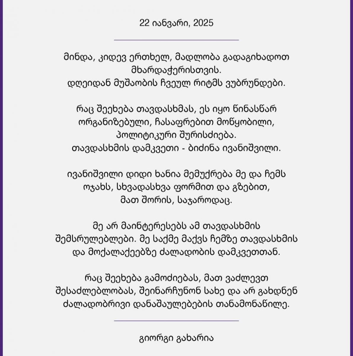 "მინდა, კიდევ ერთხელ, მადლობა გადაგიხადოთ მხარდაჭერისთვის. დღეიდან მუშაობის ჩვეულ რიტმს ვუბრუნდები. რაც შეეხება თავდასხმას, ეს იყო წინასწარ ორგანიზებული, ჩასაფრებით მოწყობილი, პოლიტიკური შურისძიება. თავდასხმის დამკვეთი - ბიძინა ივანიშვილი. ივანიშვილი დიდი ხანია მემუქრება მე და ჩემს ოჯახს, სხვადასხვა ფორმით და გზებით, მათ შორის, საჯაროდაც. მე არ მაინტერესებს ამ თავდასხმის შემსრულებლები. მე საქმე მაქვს ჩემზე თავდასხმის და მოქალაქეებზე ძალადობის დამკვეთთან. რაც შეეხება გამოძიებას, მათ ვაძლევთ შესაძლებლობას, შეინარჩუნონ სახე და არ გახდნენ ძალადობრივი დანაშაულების თანამონაწილე", - წერს გიორგი გახარია. საქართველოს პროკურატურაში ბათუმის ინციდენტთან დაკავშირებით გამოკითხვის მიზნით დაბარებულმა გიორგი გახარიამ სახელმწიფო უწყების შენობა დატოვა. როგორც გიორგი გახარიამ განაცხადა, ის ხვალ პრესკონფერენციას გამართავს და საზოგადოებას ზუსტ ინფორმაციას მიაწვდის. პოლიტიკოსმა აღნიშნული ინფორმაციის გარდა, სხვა დეტალებზე საუბრისგან თავი შეიკავა.