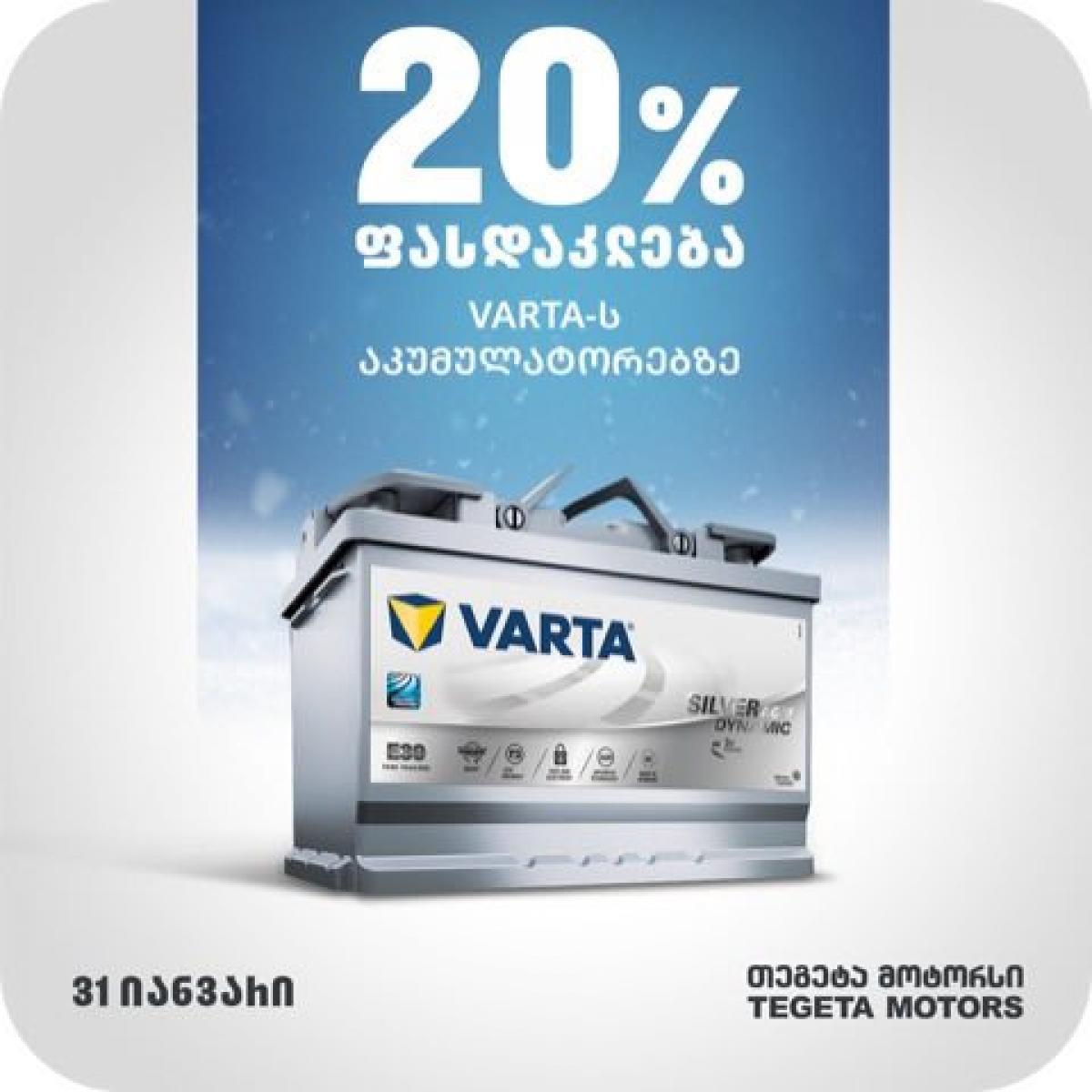 20%-იანი ფასდაკლება Tegeta.Shop-ის აკუმულატორების სრულ ასორტიმენტზე ვრცელდება, ხოლო ფილიალებში მომხმარებელს ასევე 20%-იანი ფასდაკლებით Varta -ს ბრენდის პრემიუმ ხარისხის პროდუქტის შეძენა შეუძლია. იანვრის ბოლომდე შეთავაზება მოქმედებს თურქული წარმოების, ყველაზე ხელმისაწვდომ და მაღალხარისხიან Macpower -ზე, ის მომხმარებელს „თეგეტა მოტორსის“ ფილიალებში სპეციალურ ფასად დახვდებათ.