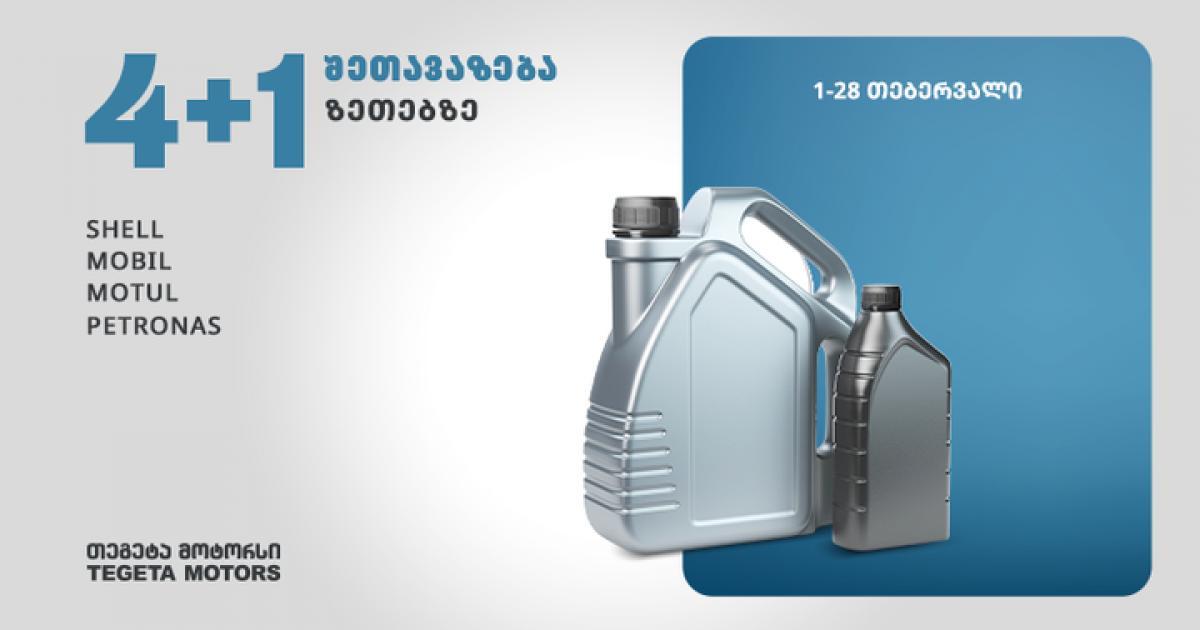 აკუმულატორებისა და საბურავების გარდა, „თეგეტაში“ სპეციალური ფასდაკლებებია პრემიუმ ბრენდის ზეთებზე. ფილიალებში 4+1 შეთავაზებები ვრცელდება SHELL-ის, MOTUL-ის, MOBIL-ისა და PETRONAS-ის პროდუქციაზე. ეს იმას ნიშნავს, რომ მომხმარებელი ყოველ შეძენილ 4 ლიტრზე მეხუთეს საჩუქრად მიიღებს. Tegeta Shop-ზე კი 20%-იანი ფასდაკლება მოქმედებს ზეთების სრულ ასორტიმენტზე. ზეთი ერთ-ერთი ყველაზე მნიშვნელოვანი კომპონენტია, რადგან ის იცავს ძრავას და უზრუნველყოფს ავტომობილის გამართულად ფუნქციონირებას. მომხმარებელმა ყურადღება უნდა მიაქციოს ავტომობილის მიერ გავლილ მანძილს და ყოველი 8000-10000 კმ-ის შემდეგ უნდა შეცვალოს ძრავის ზეთი. ამასთანავე, რეკომენდაციების მიხედვით, ძრავის ზეთთან ერთად, სასურველია, შეიცვალოს სალონისა და ჰაერის ფილტრები. აღსანიშნავია, რომ Tegeta Shop-ზე 15%-იანი ფასდაკლება მოქმედებს ავტონაწილებზეც. --თეგეტა მოტორსის შესახებ: თეგეტა ჰოლდინგში შემავალი კომპანია თეგეტა მოტორსი 1995 წლიდან ოპერირებს ბაზარზე მსუბუქი, სატვირთო და სპეციალური დანიშნულების სერვისის მიმართულებით. ავტოინდუსტრიის ლიდერი კომპანია მომხმარებელს ავტომომსახურების სრულ სპექტრს სთავაზობს, როგორც მსუბუქი და სატვირთო ავტომობილების, ისე ავტობუსებისა და მიკროავტობუსების, ასევე სპეციალური დანიშნულების ტექნიკის მიმართულებით. კომპანიას მთელი ქვეყნის მასშტაბით 28 ფილიალი აქვს, რომლებიც 500 000-მდე საცალო და 35 000-მდე კორპორაციულ მომხმარებელს ემსახურება. თეგეტა მოტორსი 300-მდე მსოფლიო ბრენდის წარმომადგენელია საქართველოში, მათ შორის არის Bridgestone, Michelin, Varta, Shell, Motul, Hengst და სხვა.