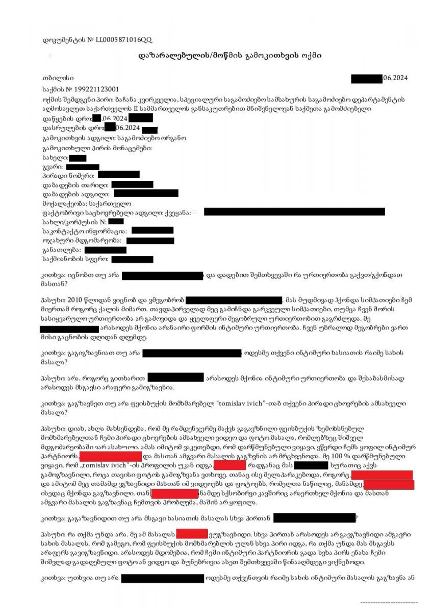 სპეციალური საგამოძიებო სამსახური სპორტული კომენტატორის სანდრო ცნობილაძის სახლში ჩხრეკასთან დაკავშირებით ინფორმაციას ავრცელებს და „მაღალი საჯარო ინტერესიდან გამომდინარე“ დაზარალებულის გამოკითხვის ოქმს ასაჯაროებს. გამოძიებით დგინდება, რომ 2022 წლიდან, დაზარალებულ ქალბატონს ერთ-ერთ სოციალურ ქსელში ყალბი გვერდიდან უცნობი პირი წერდა, რომელმაც დაარწმუნა, რომ მისი ნაცნობი იყო, რომელთანაც წარსულში ინტიმური ურთიერთობა ჰქონდა. კომუნიკაციისას, უცნობი პირი დაზარალებულს პირადი ცხოვრების ამსახველი ინტიმური შინაარსის მასალის გადაგზავნას სთხოვდა, ხოლო მოგვიანებით, როდესაც დაზარალებულმა გაგზავნილი ინტიმური შინაარსის ფოტოების და ვიდეოების წაშლა მოსთხოვა, პირმა წაშლის სანაცვლოდ შეხვედრა და ინტიმური კავშირის დამყარება შესთავაზა. საქმეზე მოპოვებული მტკიცებულებებით, მათ შორის, დაზარალებულის მიერ სხვადასხვა დროს გამოკითხვისას მოწოდებული ინფორმაციითა და „META"-დან მიღებული მასალებით დადგინდა მისამართები, რომლებზეც რეგისტრირებული ყალბი პროფილები ა.ც.-ის საცხოვრებელ და სამუშაო ადგილის მისამართებს ემთხვევა. აღნიშნული ინფორმაციის საფუძველზე, სასამართლოს განჩინებით, ჩატარდა ა. ც.-ის პირადი და საცხოვრებელი სახლის ჩხრეკა, საიდანაც ამოღებული იქნა მობილური ტელეფონი და კომპიუტერული ტექნიკა. სპეციალური საგამოძიებო სამსახური, საქმეზე გამოძიებას საქართველოს სისხლის სამართლის კოდექსის 157-ე პრიმა მუხლის პირველი ნაწილით აგრძელებს.