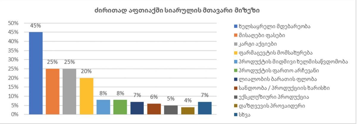 კვლევის თანახმად, მომხმარებლები აფთიაქს სხვადასხვა ფაქტორების მიხედვით ირჩევენ. უმეტესად მომხმარებლები ითვალისწინებენ ხელსაყრელ ადგილმდებარეობას, მისაღებ ფასებს, აქციებს და ფარმაცევტის კვალიფიციურ მომსახურებას.