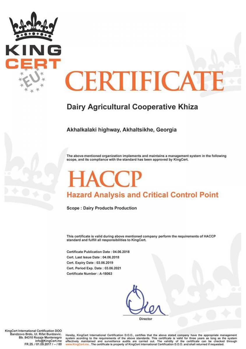 სასოფლო-სამეურნეო კოოპერატივების განვითარების სააგენტოსა და აშშ-ს საერთაშორისო განვითარების სააგენტოს (USAID) „სასოფლო-სამეურნეო წარმოების ეფექტიანობის აღდგენის პროექტს“ (REAP) შორის ტექნიკური დახმარების სფეროში თანამშრომლობის შესახებ მემორანდუმის ფარგლებში, რძის მწარმოებელ სასოფლო-სამეურნეო კოოპერატივებს შესაძლებლობა ეძლევათ სურსათის უვნებლობის საერთაშორისო სტანდარტი დანერგონ. გარემოს დაცვისა და სოფლის მეურნეობის სამინისტროს ინფორმაციით, კოოპერატივმა „ხიზამ“ USAID/REAP-ის თანადაფინანსებით “საფრთხის ანალიზისა და კრიტიკული საკონტროლო წერტილების სისტემის“ (HACCP) შესაბამისობის სერთიფიკატი მიიღო.