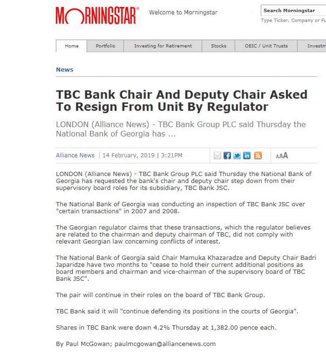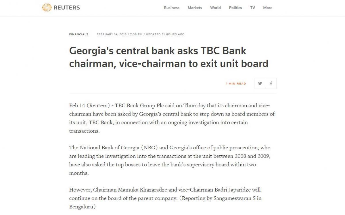 "თიბისი ბანკის" ირგვლი განვითარებულ მოვლენებს საერთაშორისო მედია ეხმაურება. როგორც სააგენტო Reuters-ი წერს, საქართველოს ეროვნულმა ბანკმა "თიბისი ბანკის" აქციონერთა კრებას 2-თვიანი ვადა მისცა, რათა მამუკა ხაზარაძე და ბადრი ჯაფარიძე სამეთვალყურეო საბჭოდან გაიწვიონ. Reuters-ი იტყობინება, რომ საქმე ეხება ტრანზაქციებს, რომლებიც 2008-2009 წლებში შესრულდა და ქვეყნის მთავარი პროკურატურა ხსენებულ ტრანზაქციებთან დაკავშირებით გამოძიებას აწარმოებს. მოვლენებს ყურადღებას კიდევ ერთი ანალიტიკური გამოცემა Morning Star აქცევს. "სებ-მა მამუკა ხაზარაძეს და ბადრი ჯაფარიძეს ვადა მისცა, რათა მან თანამდებობები დატოვონ. ამასთან საქართველოს ეროვნული ბანკის გადაწყვეტილების შემდეგ, განცხადებები თავად "თიბისი ბანკმა" და მამუკა ხაზარაძემაც გაავრცელეს, სადაც ნათქვამია, რომ პოზიციების დასაცავად დავას სასამართლოში გააგრძელებენ", - წერს გამოცემა. გარდა ამისა, Morning Star იმაზეც ამახვილებს, ყურადღებას, რომ ბანკის აქციების ფასმა ბირჟაზე იკლო.