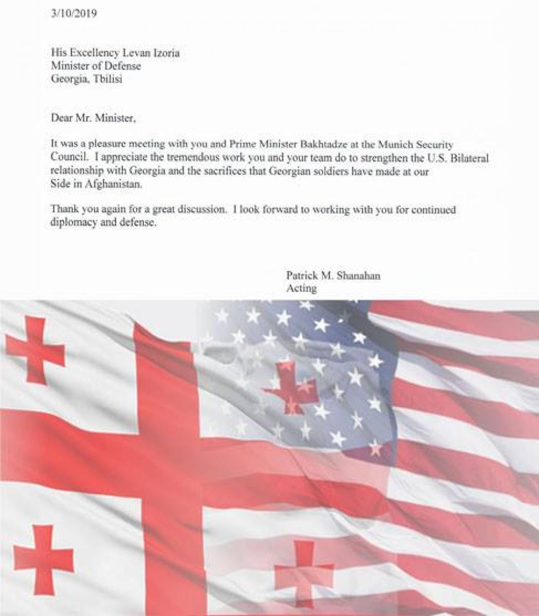 თებერვალში მიუნხენის უსაფრთხოების კონფერენციის ფარგლებში გამართული შეხვედრის შემდეგ აშშ-ის თავდაცვის მდივნის მოვალეობის შემსრულებელმა პატრიკ მ. შანაჰანიმ საქართველოს თავდაცვის მინისტრ ლევან იზორიას წერილი გამოუგზავნა. იგი წერილში აშშ-საქართველოს ორმხრივი თანამშრომლობის გაძლიერების საქმეში შეტანილ წვლილს აღნიშნავს და იმედს გამოთქვამს, რომ ორ ქვეყანას შორის თავდაცვისა და დიპლომატიის სფეროში თანამშრომლობა გაგრძელდება. „სასიამოვნო იყო თქვენთან და პრემიერ-მინისტრ ბახტაძესთან შეხვედრა მიუნხენის უსაფრთხოების კონფერენციაზე. ვაფასებ, თქვენი და თქვენი გუნდის უდიდეს ძალისხმევას აშშ-საქართველოს ორმხრივი ურთიერთობის გაძლიერების საქმეში და ჩვენს მხარდამხარ ავღანეთში მებრძოლი ქართველი ჯარისკაცების მიერ გაღებულ მსხვერპლს. კიდევ ერთხელ დიდ მადლობას გიხდით შესანიშნავი დისკუსიისთვის. ველი თქვენთან თანამშრომლობის გაგრძელებას დიპლომატიისა და თავდაცვის მიმართულებით“, - ნათქვამია პატრიკ მ. შანაჰანის წერილში.