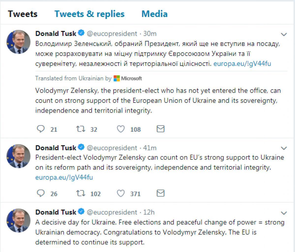 უკრაინაში საპრეზიდენტო არჩევნების მეორე ტური მსახიობისა და შოუმენის ვლადიმერ ზელენსკის გამარჯვებით დასრულდა. არჩევნებში, რომელიც ქვეყნის მასშტაბით 21 აპრილს ჩატარდა, ხმათა უმრავლესობა 73.3% ზელენსკიმ მოიპოვა, ხოლო მისმა ოპონენტმა, ქვეყნის ყოფილმა პრეზიდენტმა პეტრო პოროშენკომ ხმების 24.57% მიიღო. პრეზიდენტობის კანდიდატებმა ერთმანეთს წარმატებები ისურვეს. პეტრო პოროსენკომ აღნიშნა, რომ ის პოლიტიკიდან წასვლას არ აპირებს და "უკრაინისთვის ბრძოლას გააგრძელებს". თავის მხრივ, ახლადარჩეულმა პრეზიდენტმა ზელენსკიმ მოსახლეობას მხარდაჭერისთვის მადლობა გადაუხადა და პირობა მისცა, რომ მათ იმედებს არასდროს გაუცრუებს. ვლადიმერ ზელენსკის არჩევნებში გამარჯვება მსოფლიო ლიდერებმა უკვე მიულოცეს. ერთ-ერთი პირველი ვინც უკრაინელ კოლეგას წარმატებები უსურვა, ამერიკის შეერთებული შტატების პრეზიდენტი დონალდ ტრამპი იყო. დონალდ ტრამპმა ზელენსკიმ არჩევნებში გამარჯვება სატელეფონო საუბრის დროს მიულოცა და აღნიშნა, რომ ამერიკა უკრაინის ტერიტორიულ მთლიანობას მხარს მუდამ დაუჭერს და ვაშინგტონი ოფიციალური კიევის ურყევი პარტნიორი იქნება. ზელენსკის გამარჯვება კანადის პრემიერ-მინისტრმა ჯასტინ ტრიუდომაც მიულოცა. პრემიერმა შესაბამისი განცხადება Twitter-ის საკუთარ გვერდზე გაავრცელა. "ვულოცავ ვლადიმერ ზელენსკის უკრაინაში საპრეზიდენტო არჩევნების მეორე ტურში გამარჯვებას. მოუთმენლად ველოდები თქვენთან თანამშრომლობას, რათა უკრაინასა და კანადას შორის კავშირები უფრო გამყარდეს და ორივე ქვეყნის მოსახლეობისთვის მეტი შესაძლებლობები შეიქმნას", - წერს კანადის პრემიერი. ლიეტუვას საგარეო საქმეთა მინისტრმა ლინას ლინკევიჩუსმა Twitter-ზე დაწერა, რომ უკრაინამ გადაწყვიტა შეცვლილი და ლიეტუვა ამას მიესალმება. "უკრაინელი ხალხის არჩევანს პატივს ვცემთ და გვჯერა, რომ ყველა ცვლილება ხელს შეუწყობს უკრაინას ევრო-ატლანტიკურ ოჯახში გაწევრიანდეს. ძალიან ბევრი შრომა ჩაიდო, ძალიან ბევრი სისხლი დაიღვარა. უკრაინა ევროპაა!", - წერს ლინკევიჩუსი. ნატო-ს გენერალური მდივანი ვლადიმერ ზელენსკის გამარჯვებას ულოცავს და აღნიშნავს, რომ უკრაინა ჩრდილოატლანტიკური ალიანსის მნიშვნელოვანი პარტნიორია. ზელენსკის გამარჯვება ევროსაბჭოს პრეზიდენტმა დონალდ ტუსკმაც მიულოცა. როგორც ტუსკმა აღნიშნა, ევროკავშირი უკრაინას სრულ მხარდაჭერას უცხადებს. მისივე შეფასებით, უკრაინაში ძააუფლების გადაცემა მშვიდობიანი გზით მოხდა, რაც ძალიან მნიშვნელოვანია.