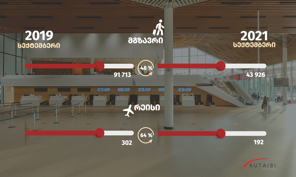 სექტემბერში ქუთაისის საერთაშორისო აეროპორტში მგზავრთნაკადი 48 %-ით, რეისების რაოდენობა კი 64 %-ით აღდგა