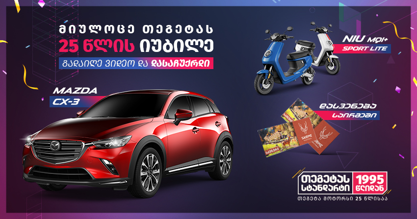 „თეგეტა მოტორსის“ 25 წლის საიუბილეო კონკურსში ახალთახალი მაზდას, ნიუს ელექტრო სკუტერების და საირმეში დასვენების ვაუჩერის მოგებაა შესაძლებელი