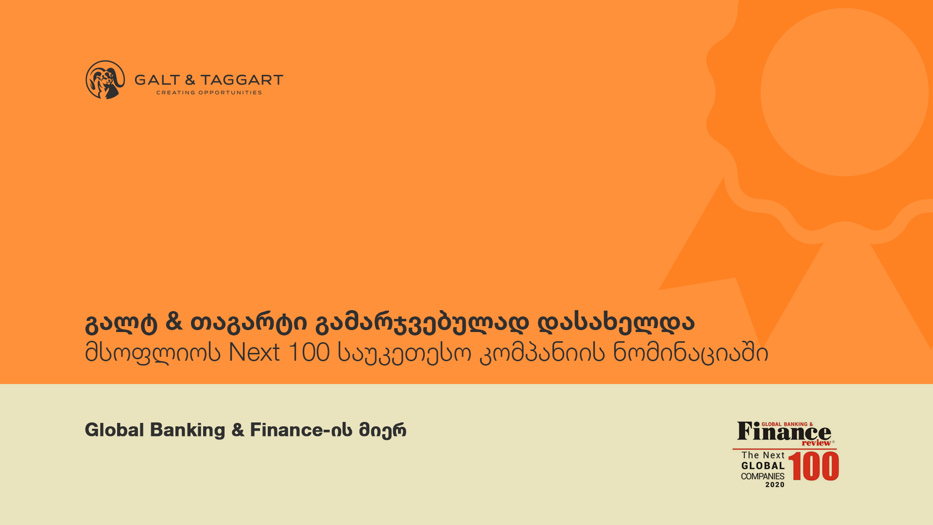 გალტ & თაგარტი Global Banking & Finance Awards-ის მიერ მსოფლიოს Next 100 საუკეთესო კომპანიის ნომინაციაში გამარჯვებულად დასახელდა