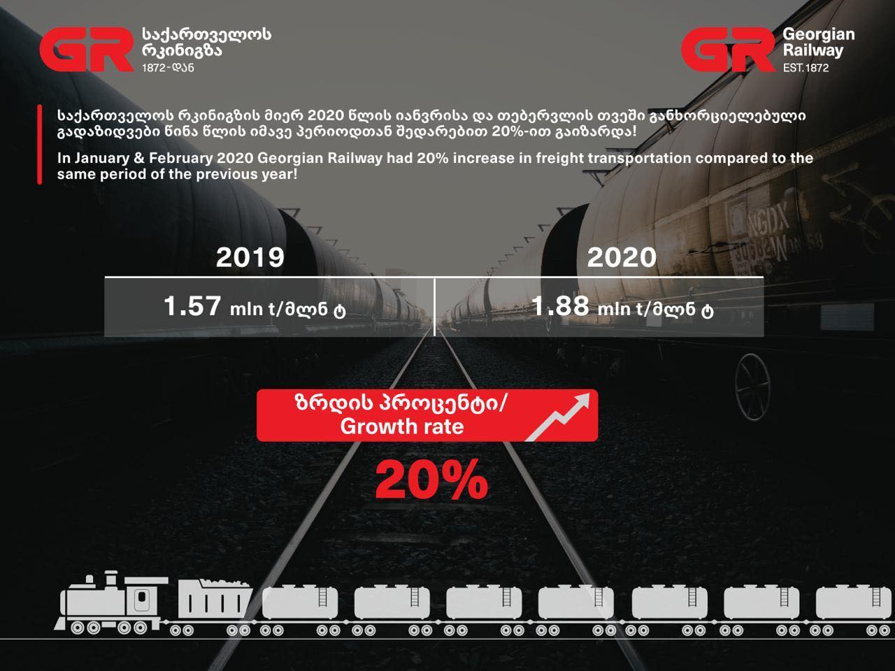 „საქართველოს რკინიგზა“ - 2020 წლის იანვრისა და თებერვლის თვეში განხორციელებული გადაზიდვები წინა წლის იმავე პერიოდთან შედარებით 20%ით გაიზარდა