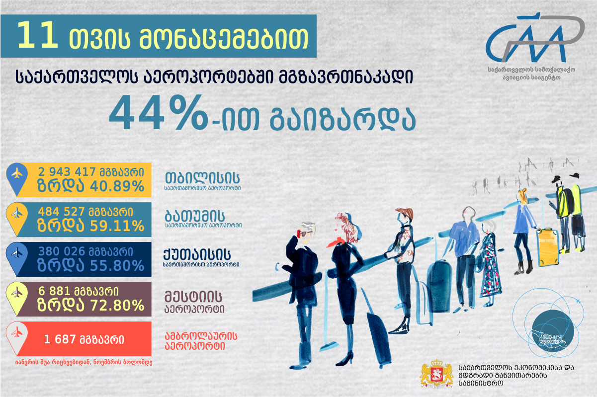 11 თვის მონაცემებით, საქართველოს აეროპორტებში მგზავრთნაკადი 44%-ით არის გაზრდილი