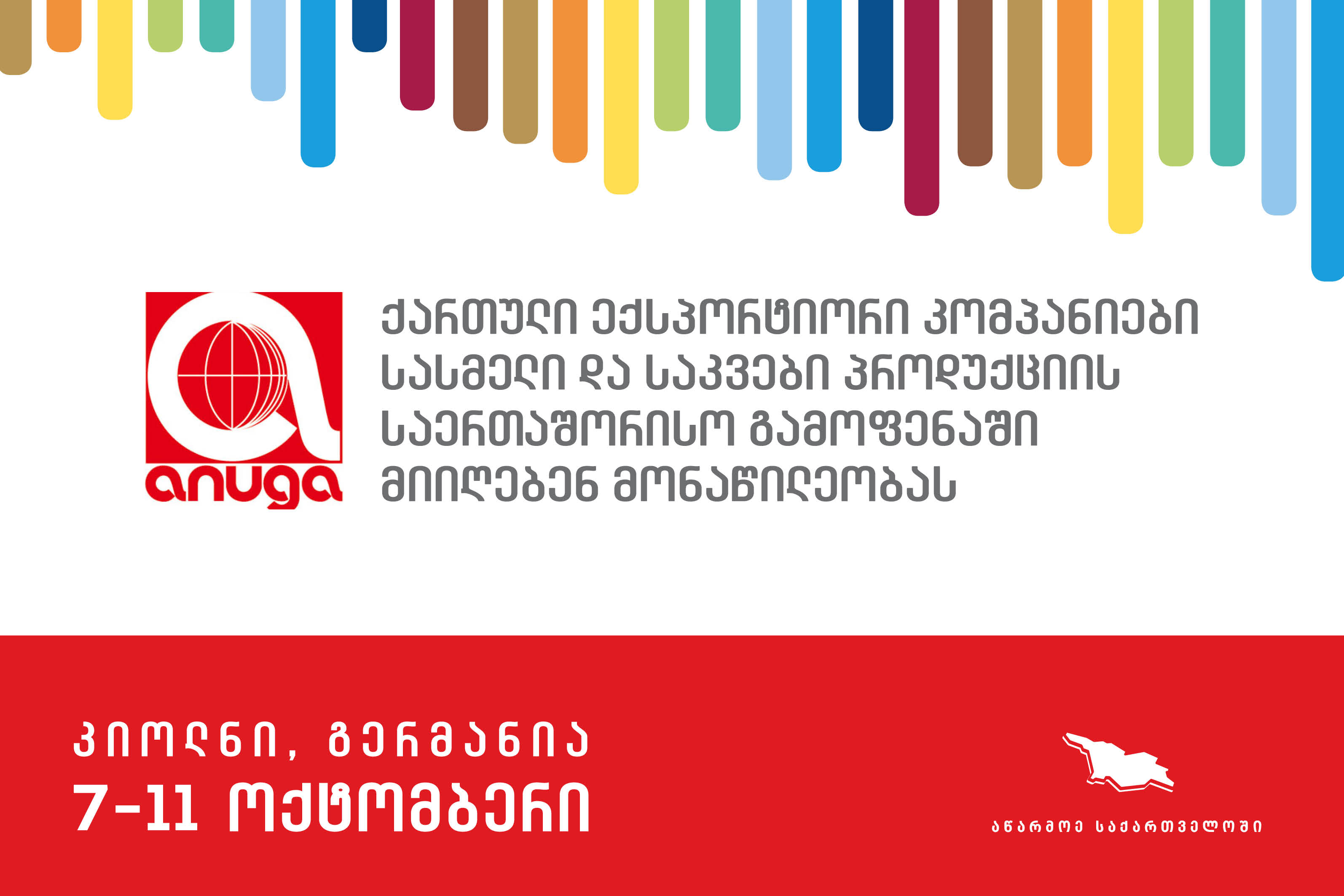 საქართველოს ეკონომიკისა და მდგრადი განვითარების სამინისტროს სააგენტოს „აწარმოე საქართველოში“ მხარდაჭერით, ქართული ექსპორტიორი კომპანიები 2017 წლის 7 - 11 ოქტომბერს, გერმანიაში, ქალაქ კიოლნში სასმელი და საკვები პროდუქციის საერთაშორისო გამოფენაში მონაწილეობენ.