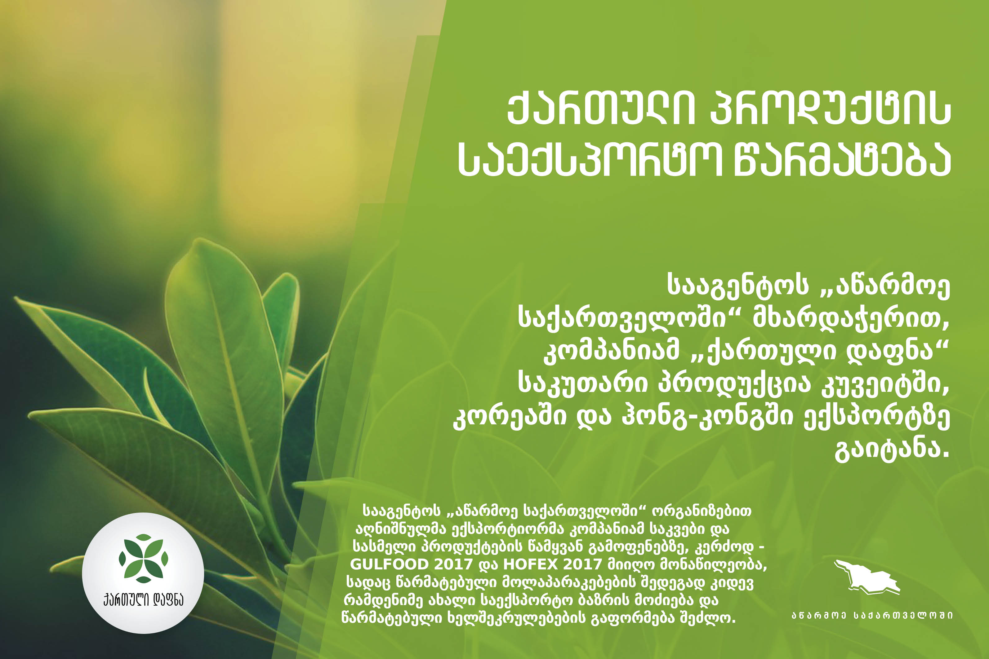 საქართველოს ეკონომიკისა და მდგრადი განვითარების სამინისტროს სააგენტოს „აწარმოე საქართველოში“ ექსპორტის ხელშეწყობის მიმართულების მხარდაჭერით, კომპანიამ „ქართული დაფნა“ საკუთარი პროდუქცია ქუვეითში, კორეაში და ჰონგ-კონგში ექსპორტზე გაიტანა.
