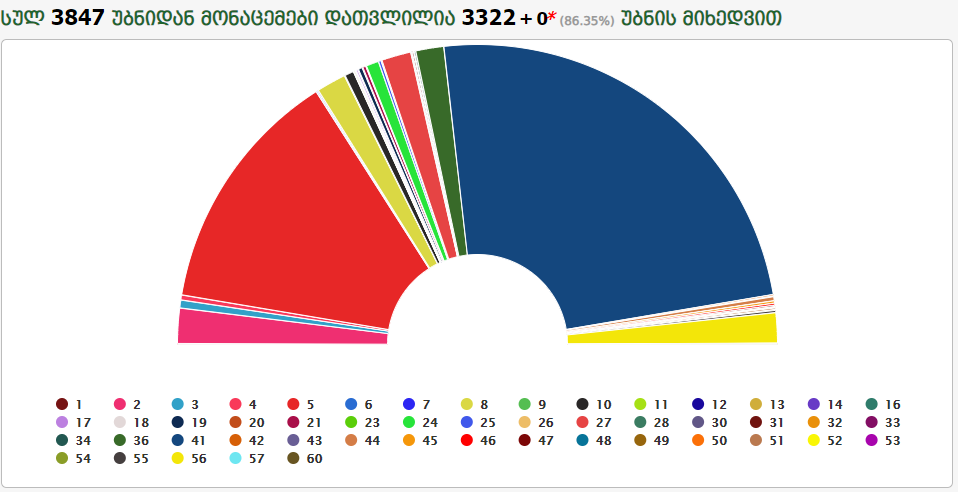 დათვლილია 3 322 უბნის მონაცემები - „ქართული ოცნება“ 48.27 %, „ნაციონალური მოძრაობა“ 26.64%