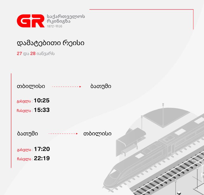საქართველოს რკინიგზა 27 და 28 იანვარს თბილისი-ბათუმი-თბილისის მიმართულებით რეისებს ამატებს