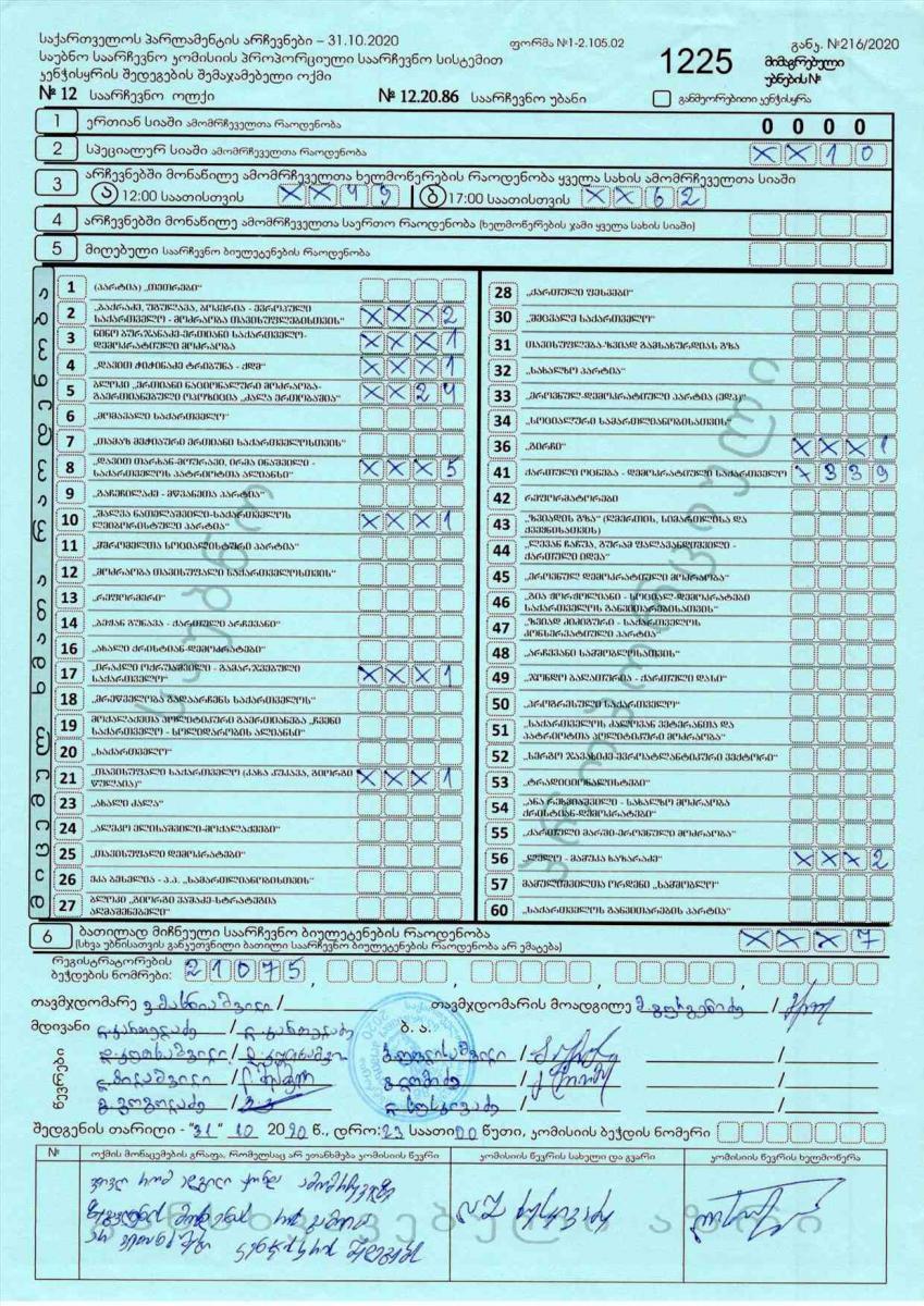 12-ე საარჩევნო ოლქში, რუსთავის # 12.28.86 საარჩევნო უბნის შემაჯამებელი ოქმის მიხედვით, „ქართულმა ოცნებამ“ 339 ხმა მოიპოვა, რეალურად კი 17 საათისთვის 62 ამომრჩეველი მივიდა. ოქმში ასახულია ამომრჩეველთა აქტივობა დღის 12 და 17 საათებისთვის, თუმცა ოლქში არ გვხდება ამომრჩეველთა საერთო რაოდენობა, რომლებმაც მიიღეს მონაწილეობა არჩევნებში და მიღებული საარჩევნო ბიულეტინების რაოდენობა. აღნიშნული გრაფები ოქმში ცარიელია, ცნობილია, რომ დღის 12 საათისთვის უბანზე 49 ამომრჩეველი მივიდა, ხოლო 17 საათისთვის ეს რაოდენობა 62-მდე გაიზარდა. ასევე ოქმის მიხედვით ბათილად მიიჩნიეს 7 ბიულეტინი. აღნიშნული ოქმი ცესკოს ოფიციალურ საიტზეა ატვირთული.