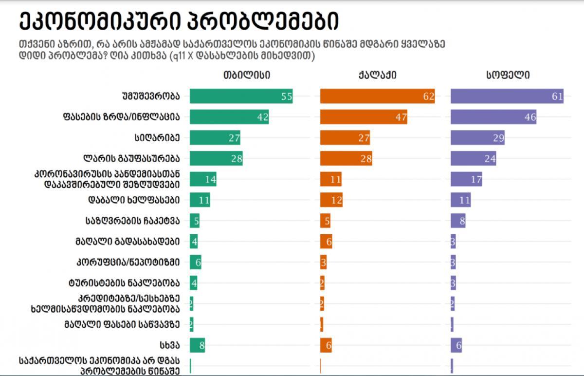 ანგარიშის თანახმად, მოსახლეობის 27% თვლის, რომ ეკონომიკის მთავარი გამოწვევა სიღარიბეა, 28%-სთვის ლარის გაუფასურება, 14%-ისთვის კორონავირუსთან დაკავშირებული საკითხები, 11%-სთვის კი დაბალი ხელფასი.
