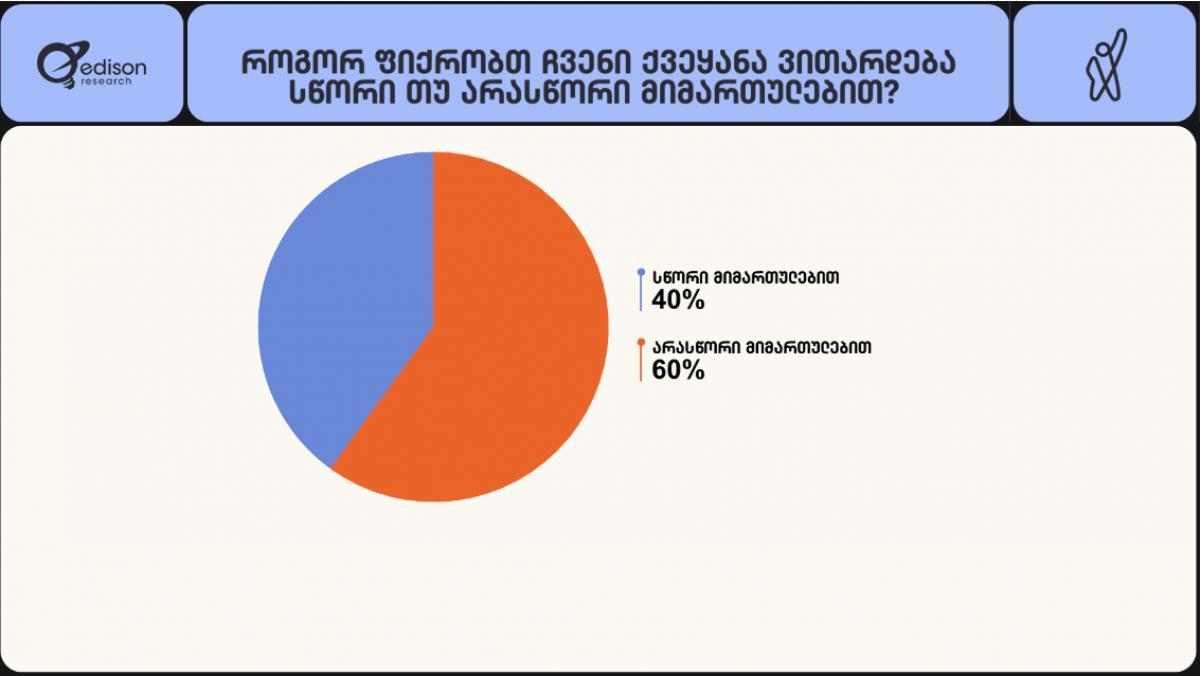 საერთაშორისო კვლევითი კომპანია Edison Research-ის კვლევის თანახმად, რომელსაც ტელეკომპანია "ფორმულა" ავრცელებს, მოსახლეობის 60% ფიქრობს, რომ ქვეყანა არასწორი მიმართულებით ვითარდება. შეკითხვაზე, როგორ ფიქრობთ ჩვენი ქვეყანა ვითარდება სწორი თუ არასწორი მიმართულებით, პასუხები ასე გადანაწილდა: