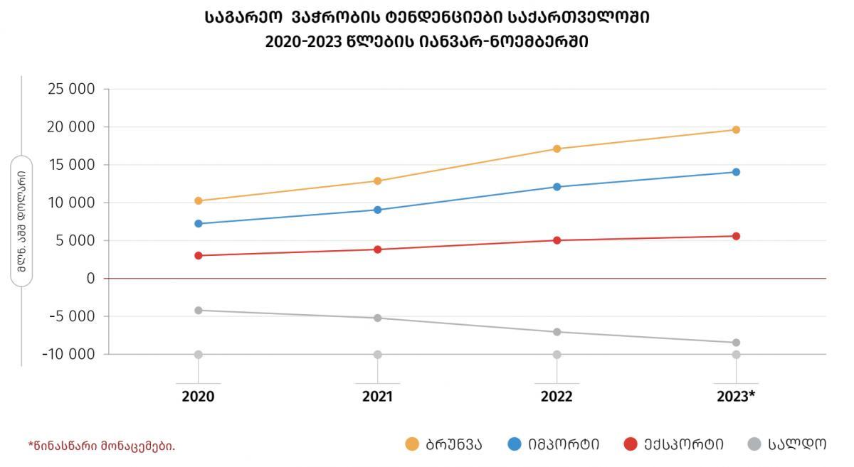საქსტატის ცნობითვე, საქართველოს უარყოფითმა სავაჭრო ბალანსმა 2023 წლის იანვარ-ნოემბერში 8 457.8 მლნ აშშ დოლარი შეადგინა, რაც საგარეო სავაჭრო ბრუნვის 43.1 პროცენტია.