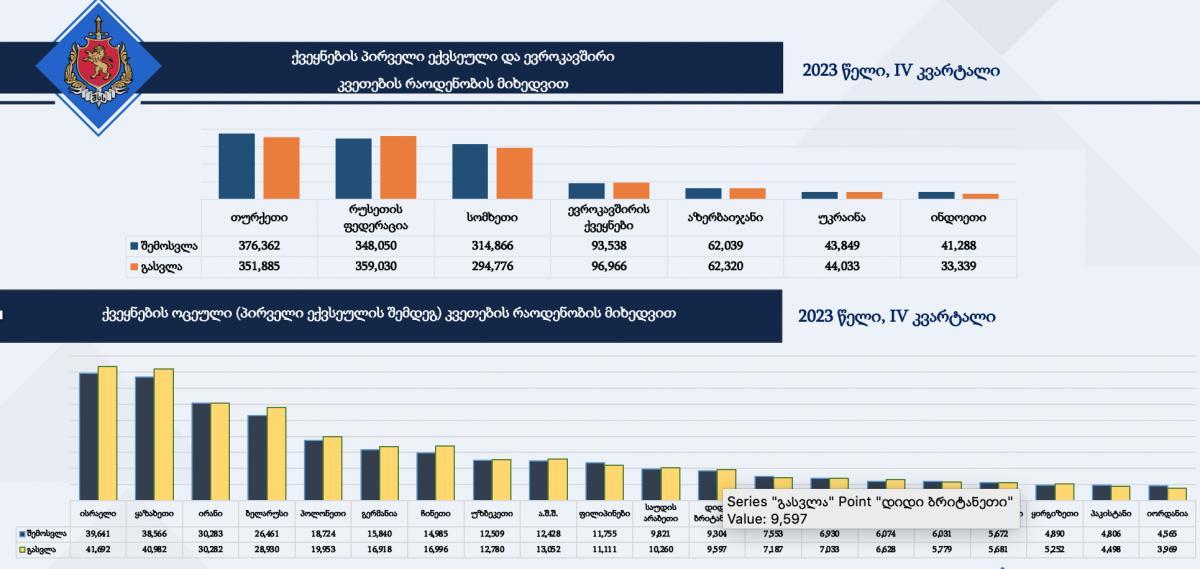 დოკუმენტის მიხედვით, მეოთხე კვარტალში საქართველოს სახელმწიფო საზღვრის კვეთის რაოდენობის მიხედვით, პირველი ადგილი თურქეთის რესპუბლიკამ დაიკავა, ხოლო თურქეთის შემდეგ პირველი ექვსეული ასე გამოიყურება: რუსეთი, სომხეთი, ევროკავშირის ქვეყნები, აზერბაიჯანი, უკრაინა და ინდოეთი. გარდა ამისა, დოკუმენტში აღნიშნულია, რომ 2023 წლის მეოთხე კვარტალში, საქართველოს სახელმწიფო საზღვრის კვეთა (შემოსვლა და გასვლა) ჯამში, 4 609 381-ჯერ განხორციელდა, ხოლო საზღვრის მკვეთავების 33% ქართველები, 67% კი უცხოელები იყვნენ.