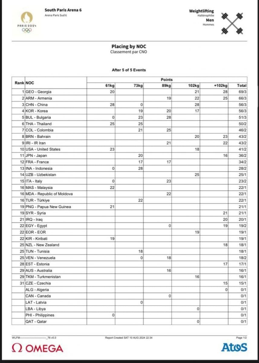 საქართველოს ძალოსანთა ნაკრებმა ოლიმპიურ თამაშებზე გუნდური პირველი ადგილი დაიკავა