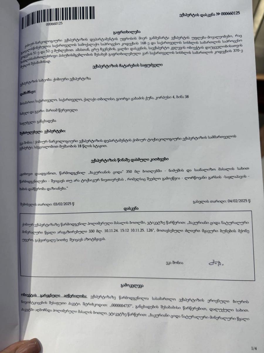 ნინო ფრიდონიშვილი სოციალურ ქსელში "ბაკურიანი ციდას" წყლით მცირეწლოვნის ინტოქსიკაციის შესახებ ინფორმაციას ავრცელებს. როგორც მოქალაქე იუწყება, ბოთლი სამხარაულის ექსპერტიზის ბიუროს გადასცეს. ექსპერტიზის შედეგად კი ბოთლში აზოტმჟავა აღმოაჩინეს.